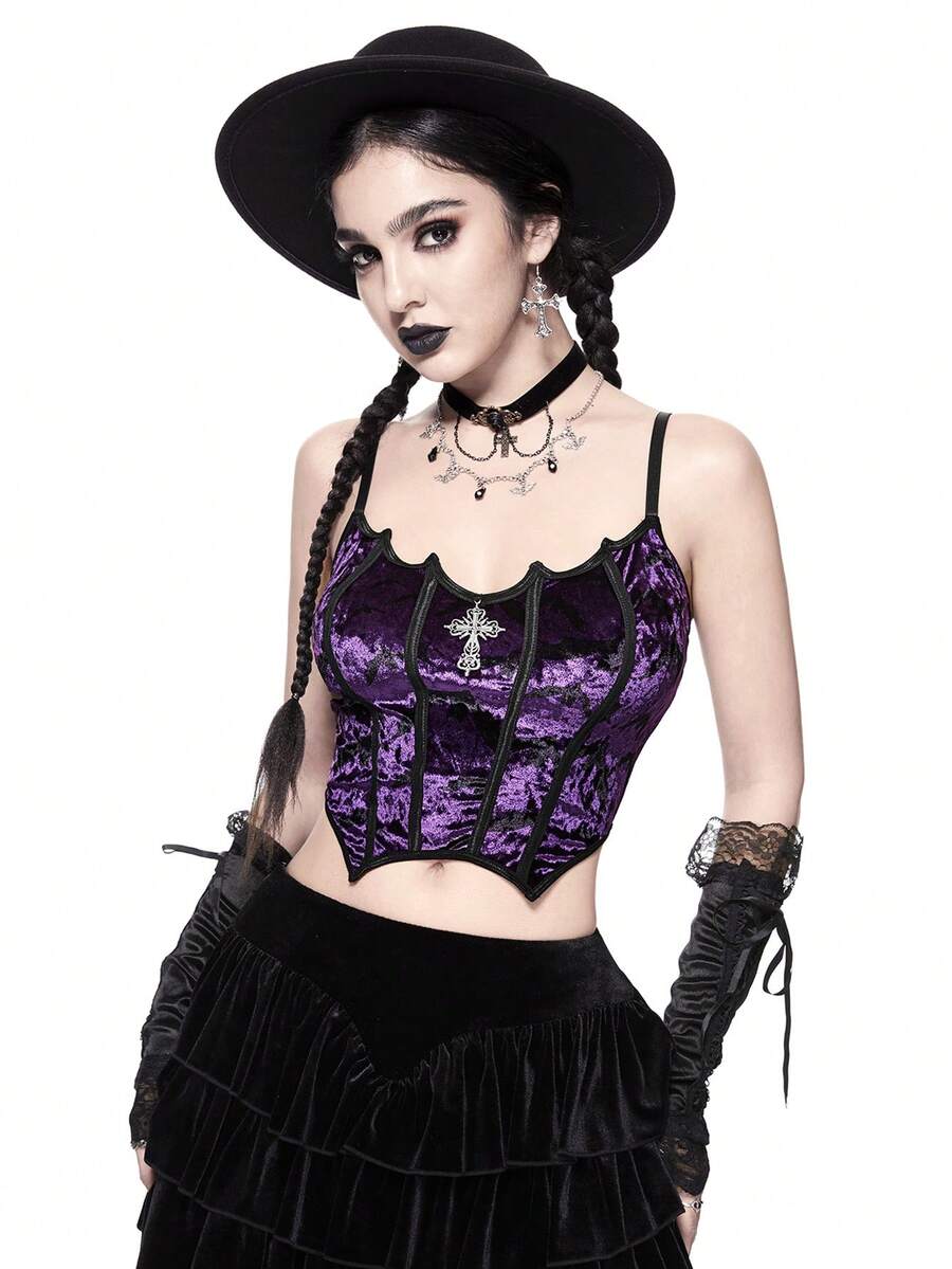 Goth Gothic Allover-Muster Fledermaus & Kreuz Dekor Samt Trägertop für Damen