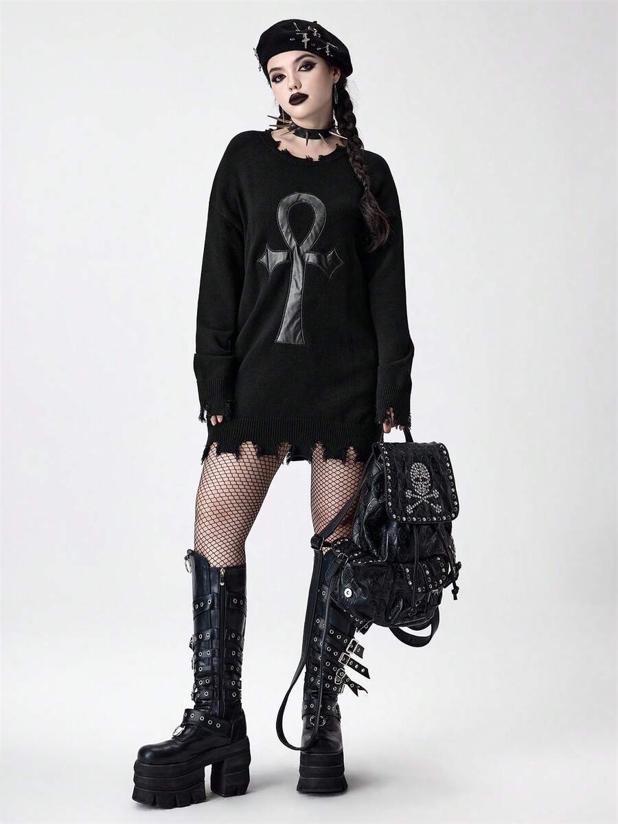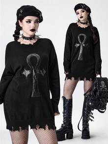 Gothic Ankh Symbol bestickter abgenutzter Design Damen Pullover