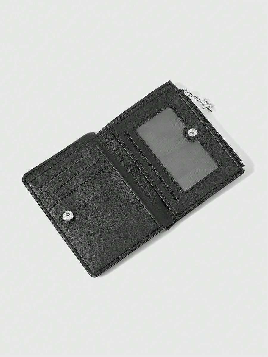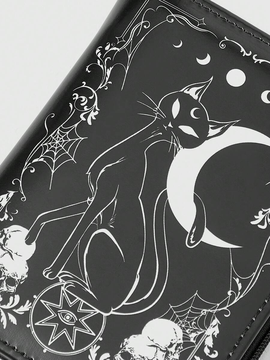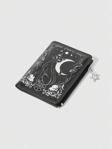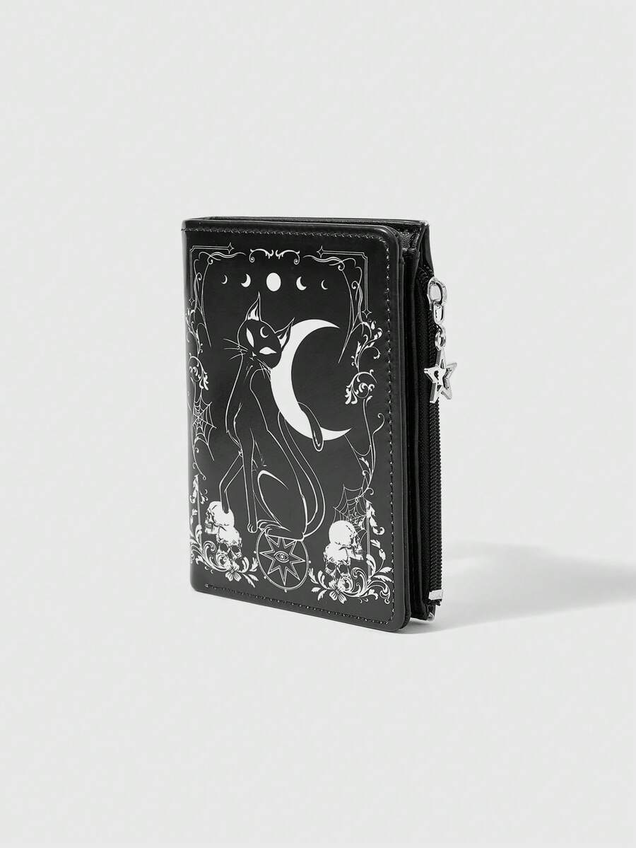 Goth Gotischer Halbmond & Schwarze Katze Muster Multifunktions Mehrfach-Kartenfach Fünfzackiger Stern Reißverschluss Kurzbörse, Lässige Mode Kartenetui, Münzbörse