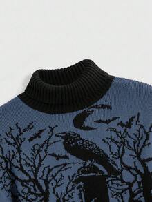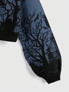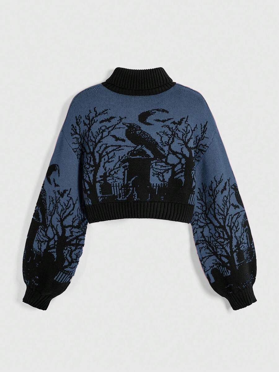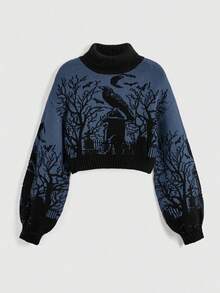 Goth Gotischer, dunkel-hochgeschlossener, warmer Raben-Friedhof-Mond-Fledermaus-Zweig-Jacquard-Schwarz-Laterne-Ärmel Damen Pullover