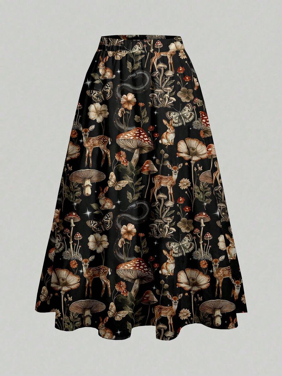 Fairycore Gothic dunkler Pilz Mori Stil Hirsch Muster weite ausgestellte Große Größen Rock