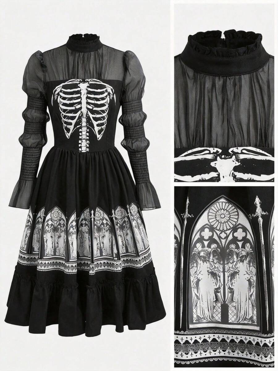 Goth Gotischer dunkler Schädel Skelett Kirche mittelalterlicher Stein Muster A-Linie Midi Kleid für Frauen