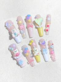 Anime 10pcs Cute Bowknot Music Note Star Element High Quality Handmade False Nails + 3pcs Double-Sided Adhesive, Y2K French Style Rhinestone Chain Polka Dot Removable Nail Art Stickers, Suitable For Holidays, Parties, Dancing And Daily Wear