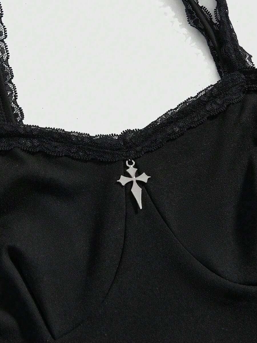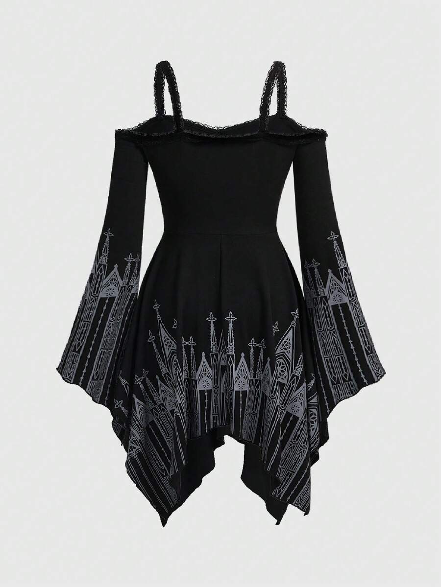 Goth Gotischer Stil Off-Shoulder Kontrastspitzen-Kirchenmuster-Kleid mit asymmetrischem Saum