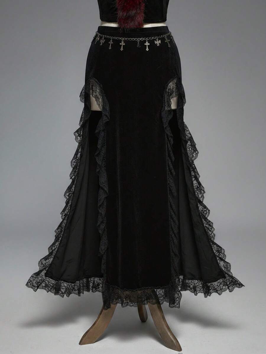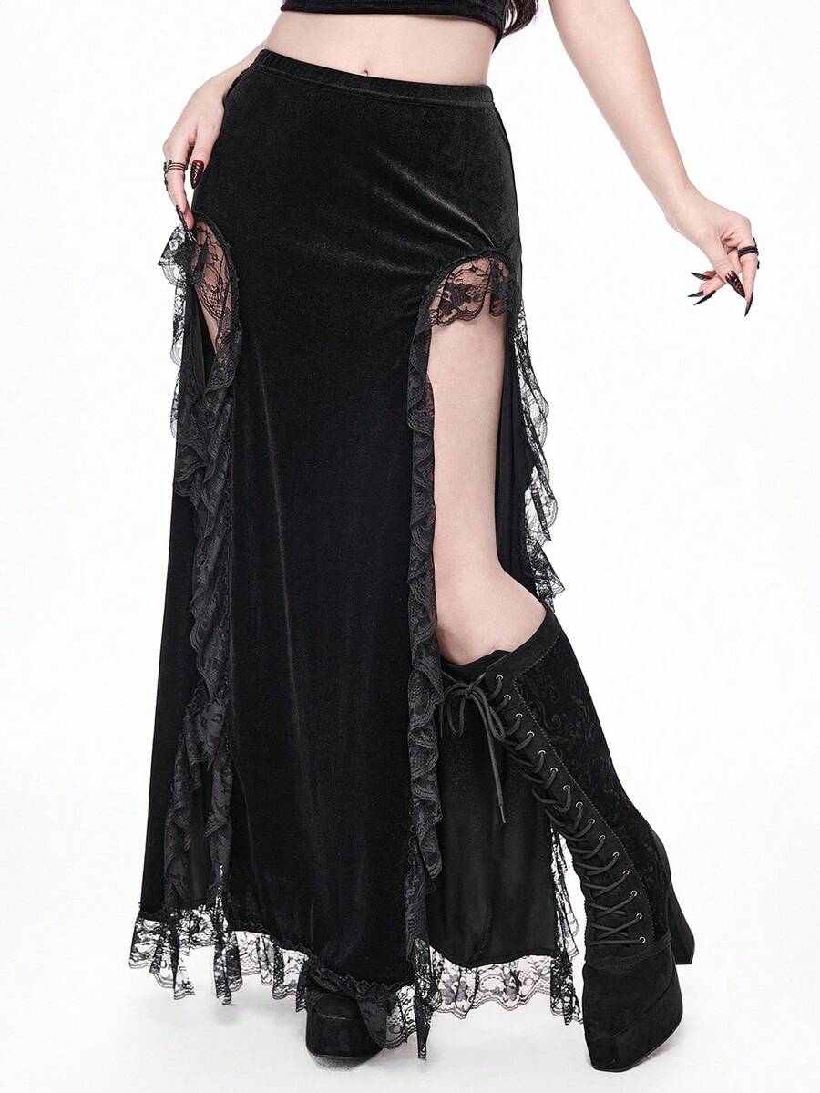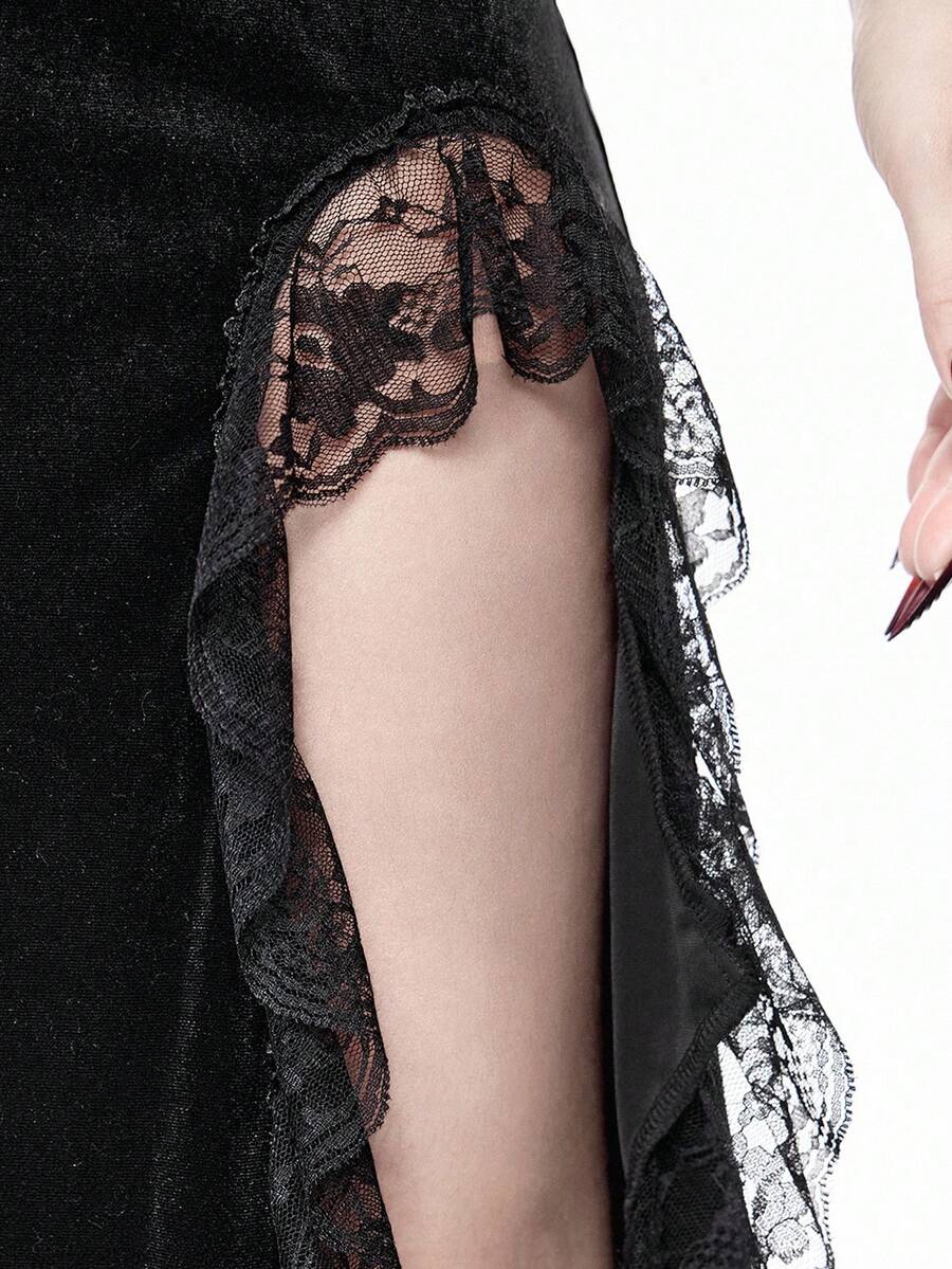 Goth Gotischer Stil sexy Damen Rock mit hohem Schlitz, Spitze-Patchwork und Samt