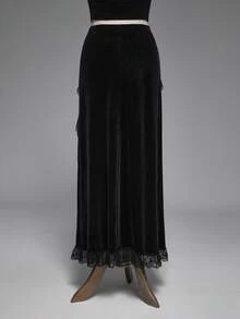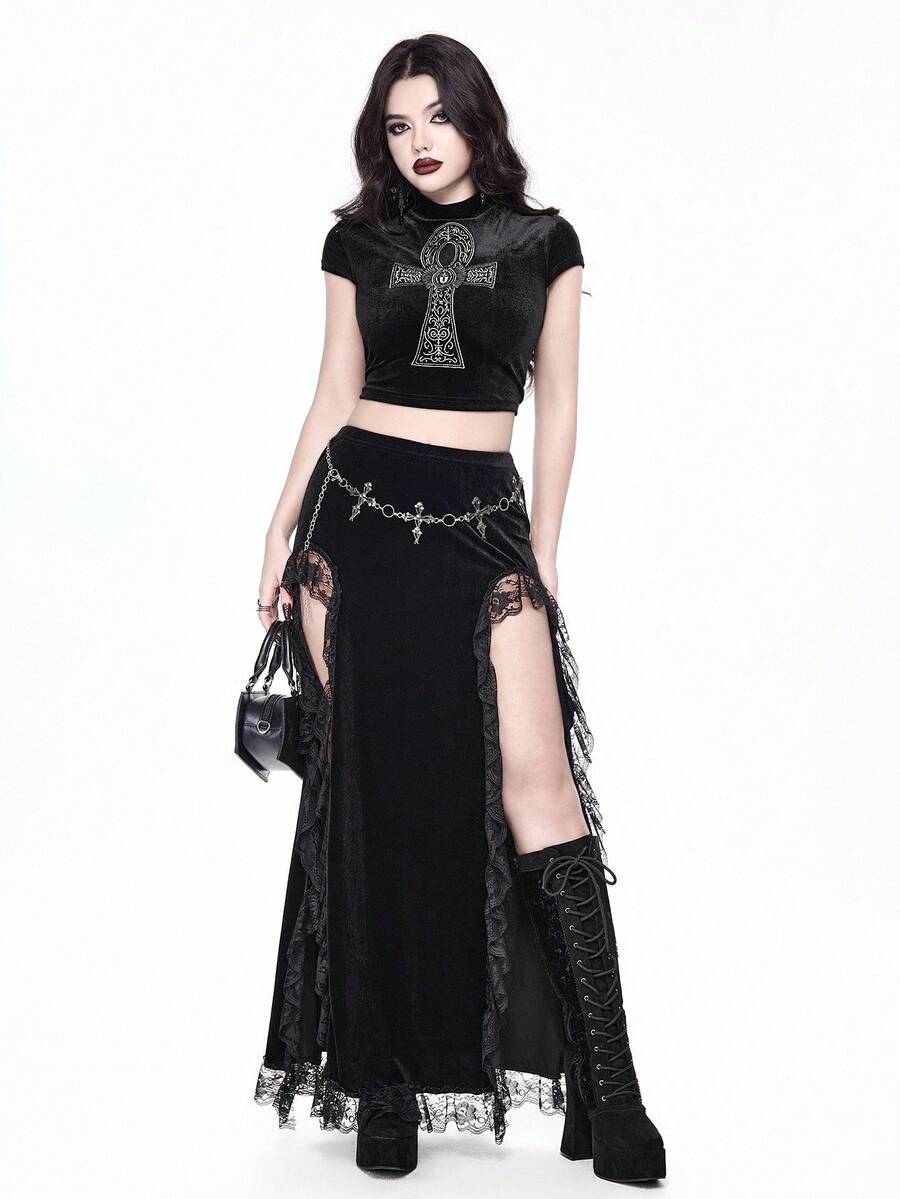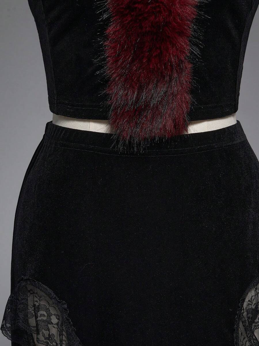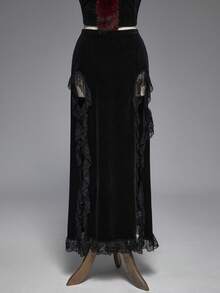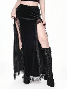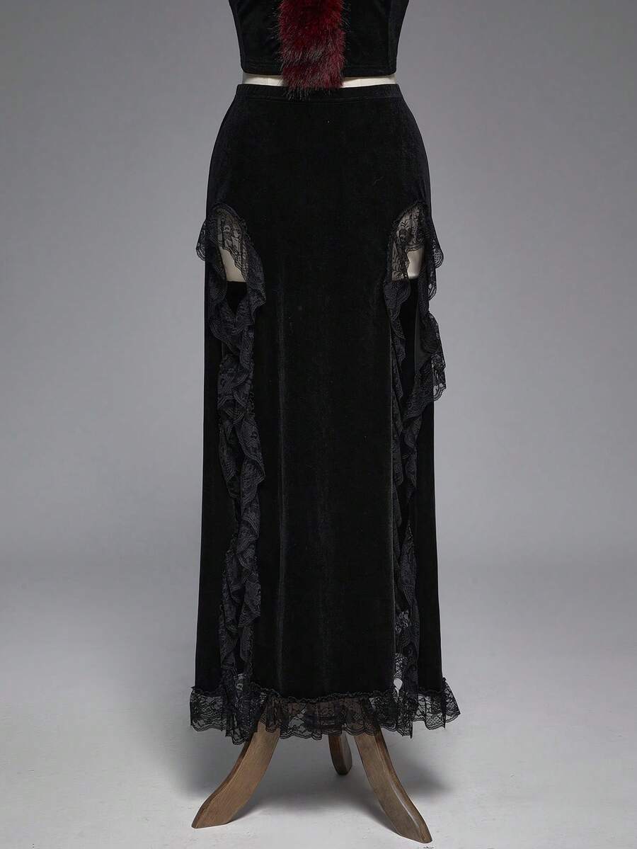 Goth Gotischer Stil sexy Damen Rock mit hohem Schlitz, Spitze-Patchwork und Samt