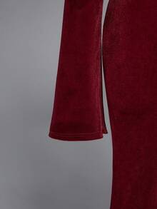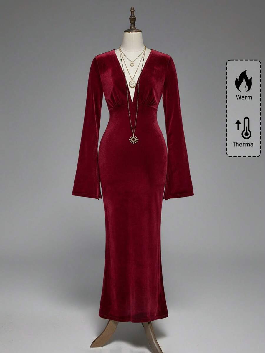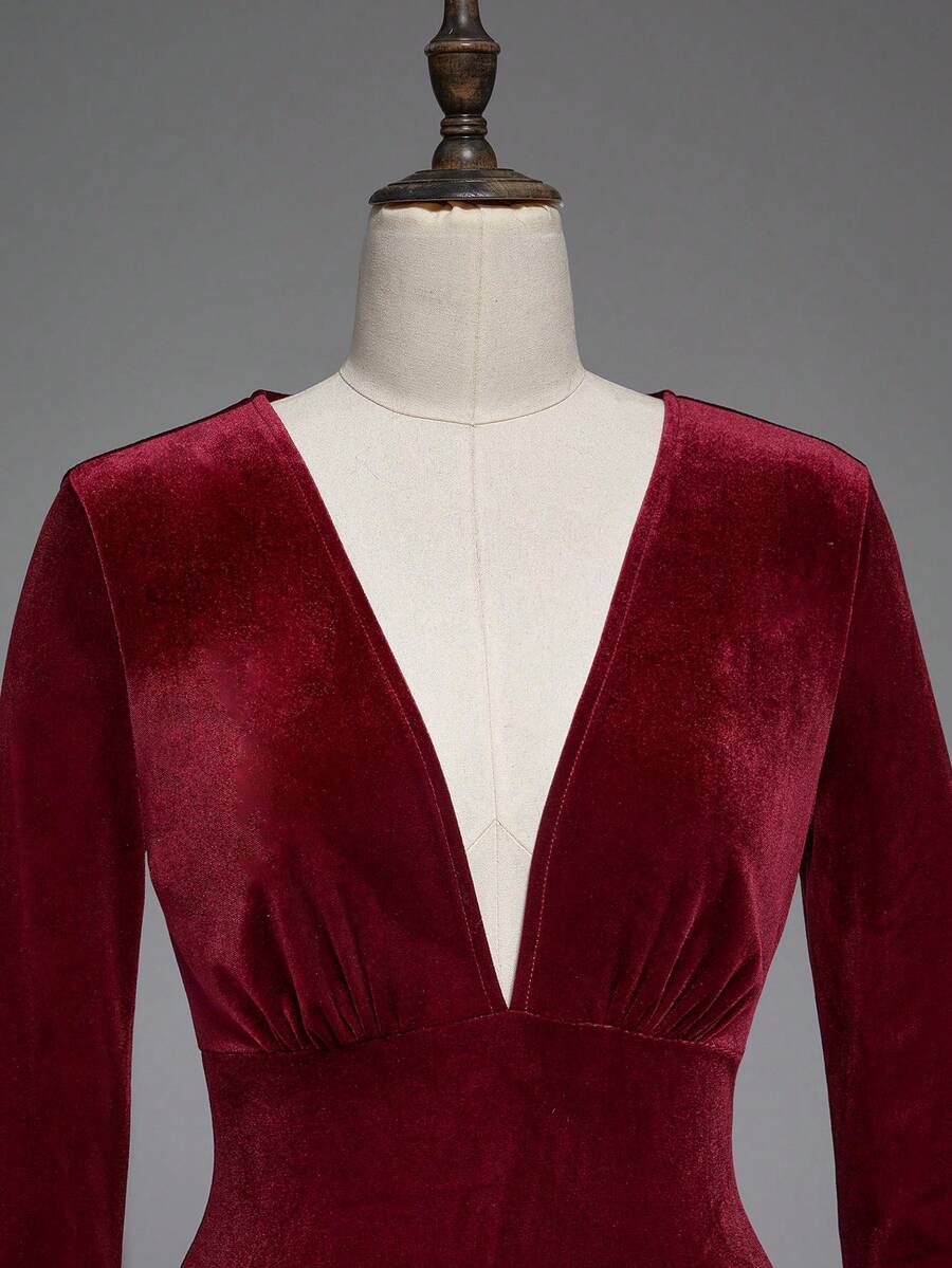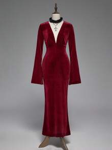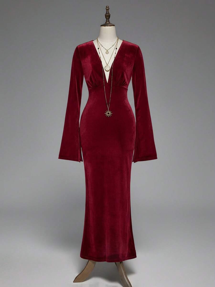 Goth Gotischer Stil figurbetontes langärmliges burgunderrotes Meerjungfrauenkleid mit V-Ausschnitt