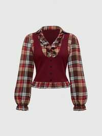 Vintage Gothic Karomuster Patchwork Langarm Bluse für Damen in Große Größen, ideal für den Schulanfang