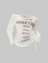 Grunge Punk Romantisches Punk Kreuz & Buchstaben Muster Off-Shoulder Große Größen Damen Langarm T-Shirt Top