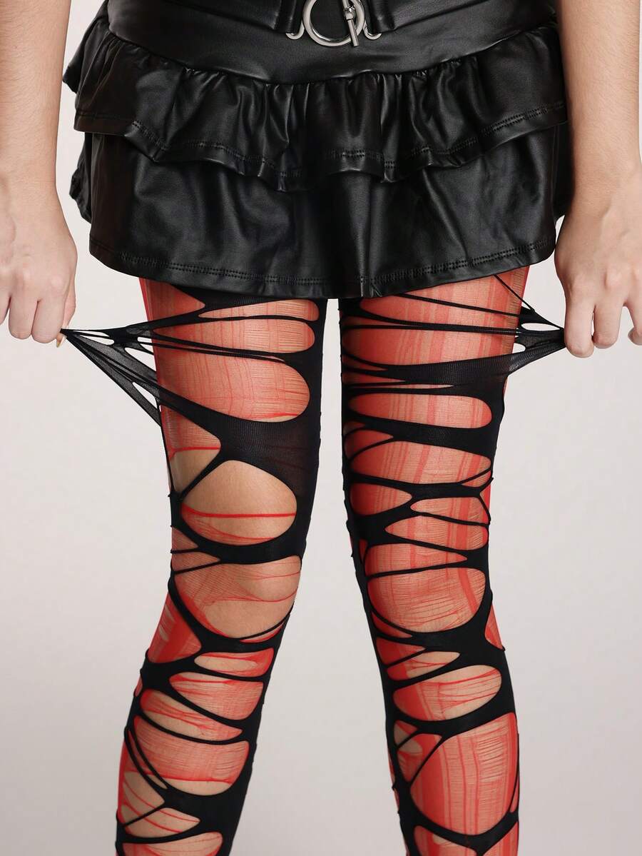 Grunge Punk 1 Paar minimalistische rote Strümpfe (die Strümpfe müssen selbst zerrissen werden) + 1 Paar zerrissene schwarze Strumpfhose, Y2K Strumpfhosen Kombinations-Set, vielseitig einsetzbare, halbtransparente, sexy, elastische Strumpfhose für den täglichen Gebrauch