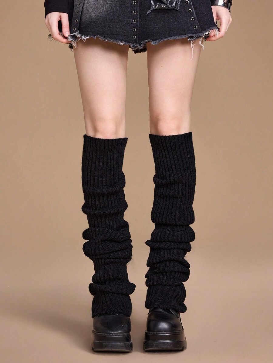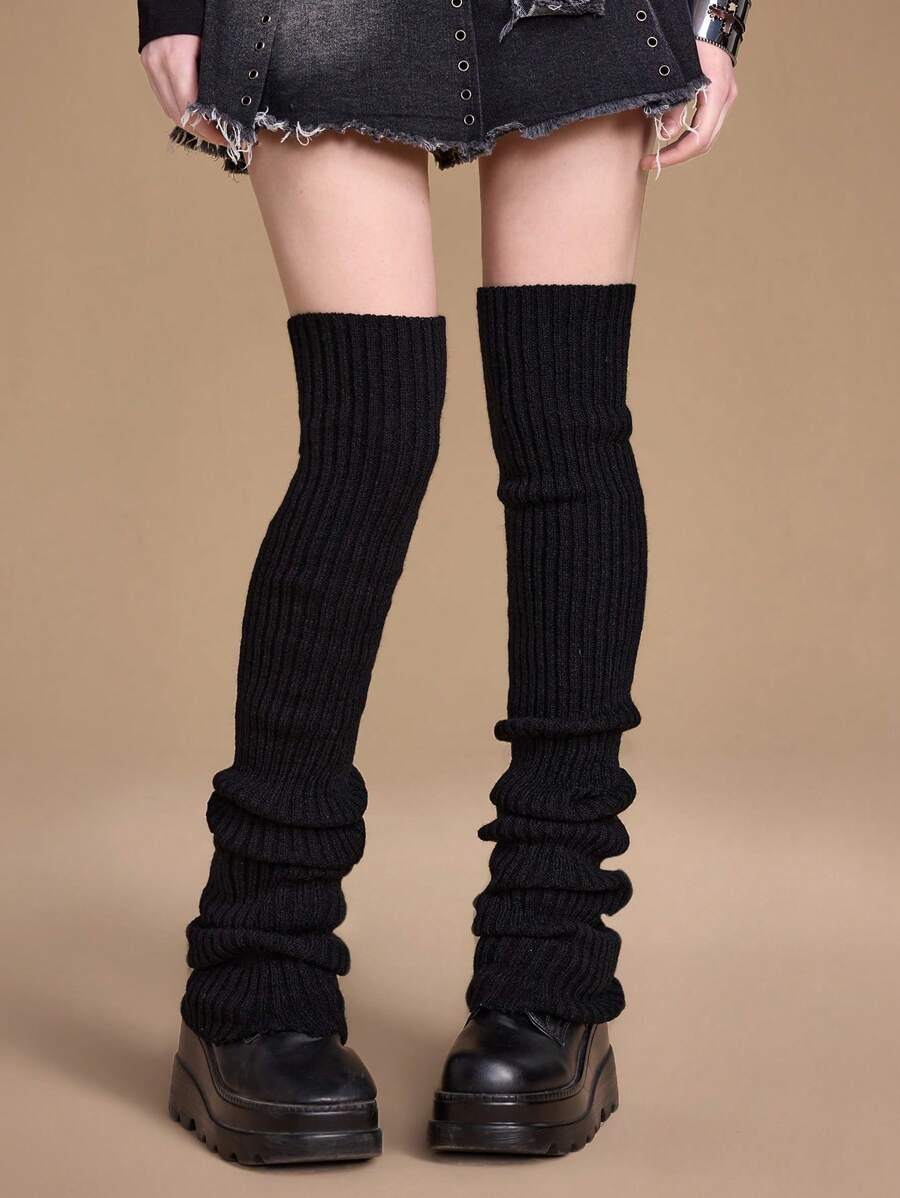 Grunge Punk 1 Paar Damen Thermolangbein Stulpen, ganzjährig, einfarbig schwarz mit vertikalen Streifen, 90cm gestrickt