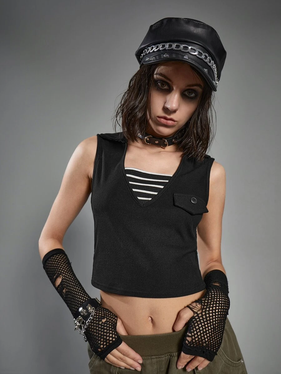 Grunge Punk Tank Top mit 2 in 1 Streifen, Knopf