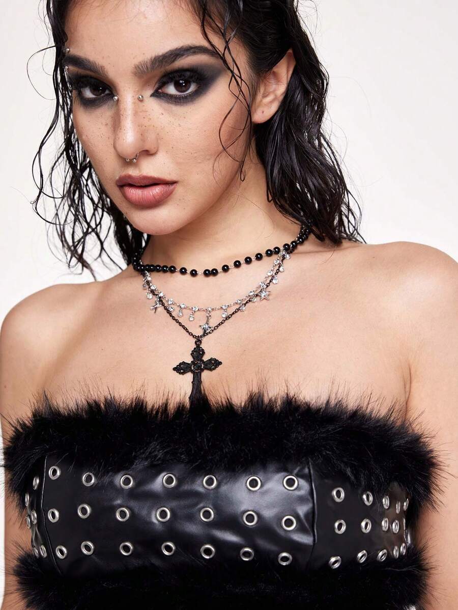 Grunge Punk 3er Set Goth Y2K Stern Kreuz Strass Quaste Schwarz Perlen Halskette für Frauen