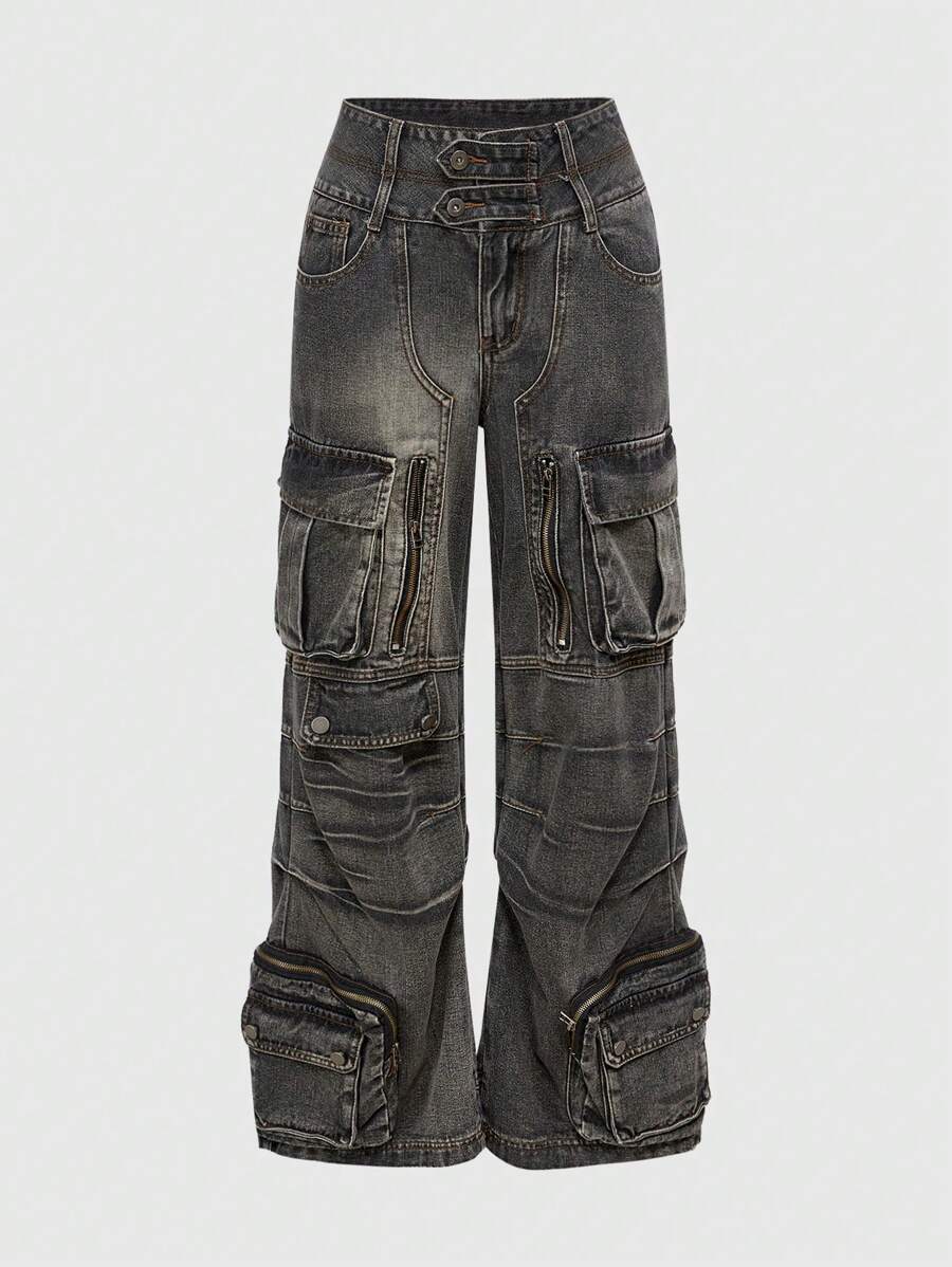 Grunge Punk Apokalyptisch abgenutzt vintage gewaschene Oversized Cargo Taschen Weites Bein Damen Jeans, industrieller Workwear Stil