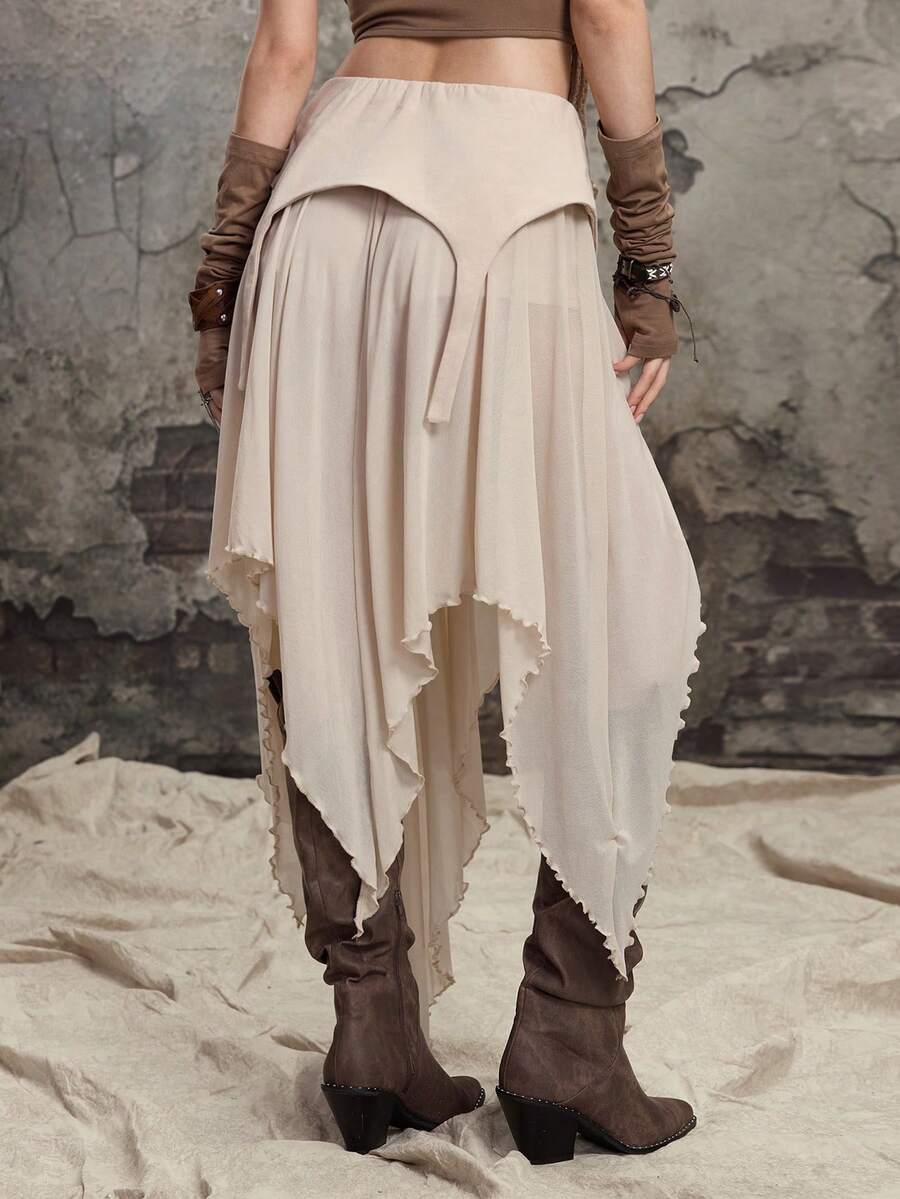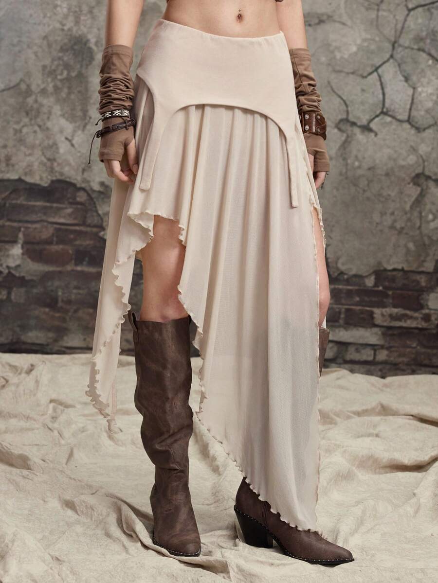Grunge Punk Bohemien Patchwork Mesh Rock mit hohem Schlitz und asymmetrischem Saum, mittellang für Damen