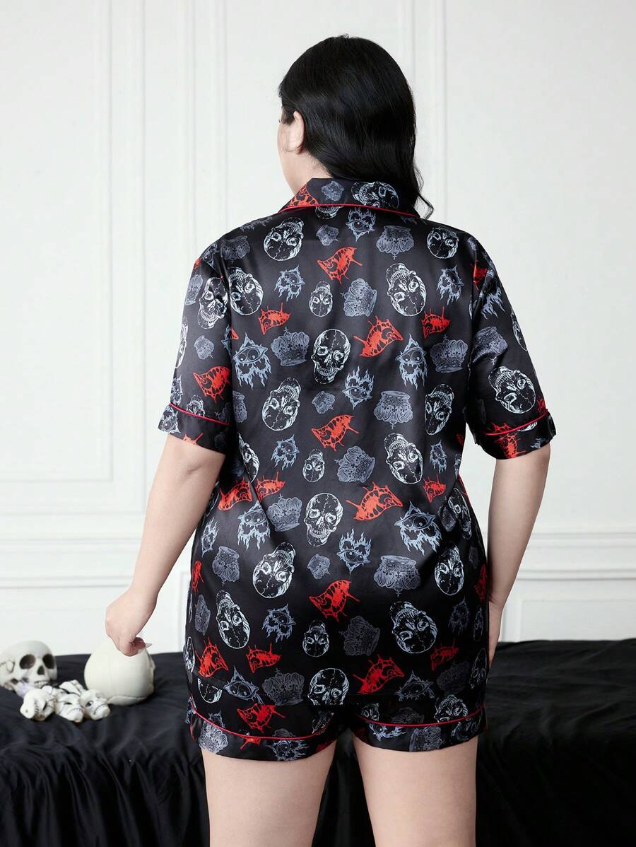 Grunge Punk Punk Gothic Satin Pyjama Set mit kurzen Ärmeln und Shorts, Schädel Zähne Muster