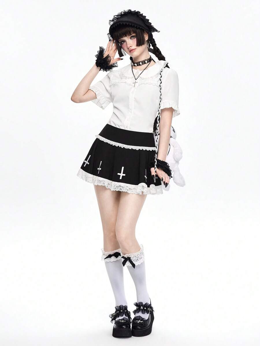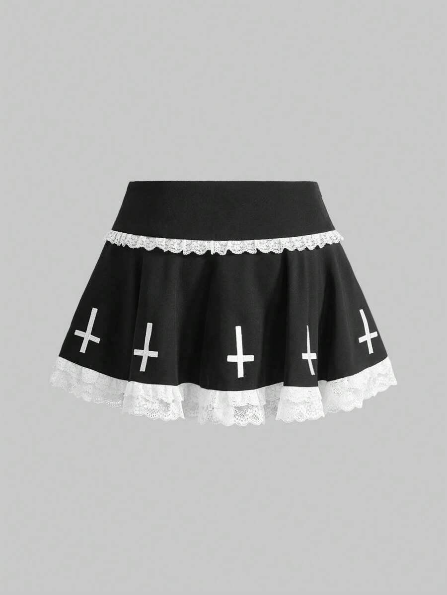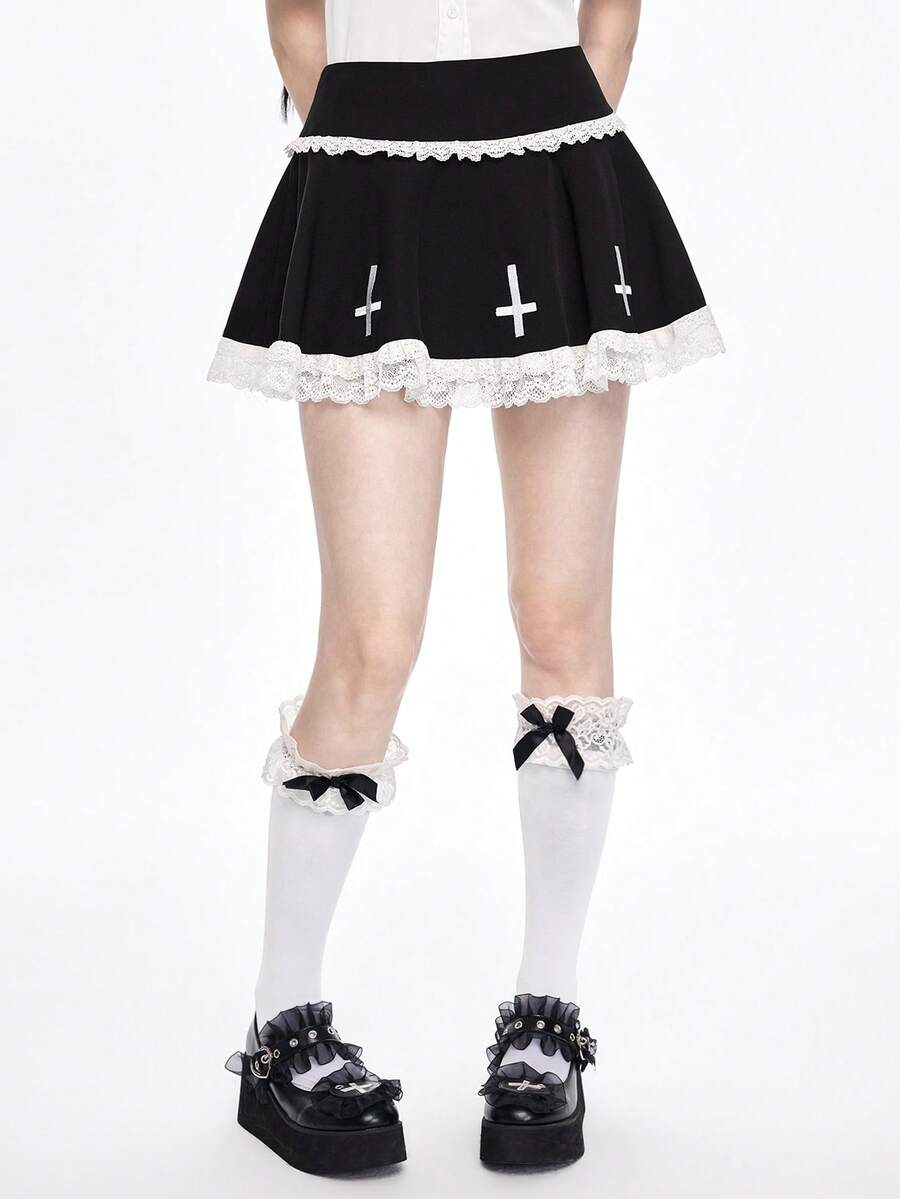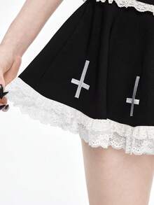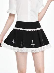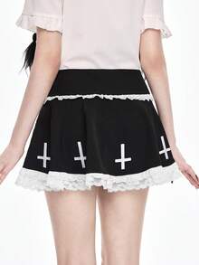 Grunge Punk Gothic Kreuz Muster Kontrast Spitze Super Tief Taille Mini Plissee Rock
