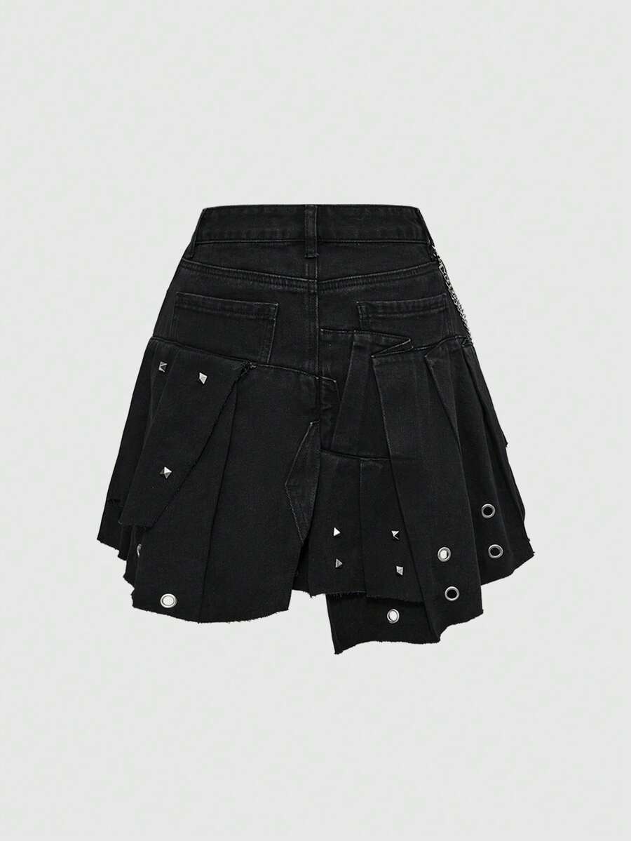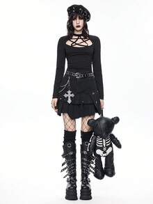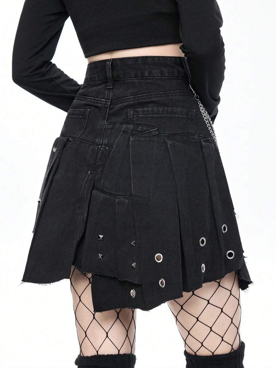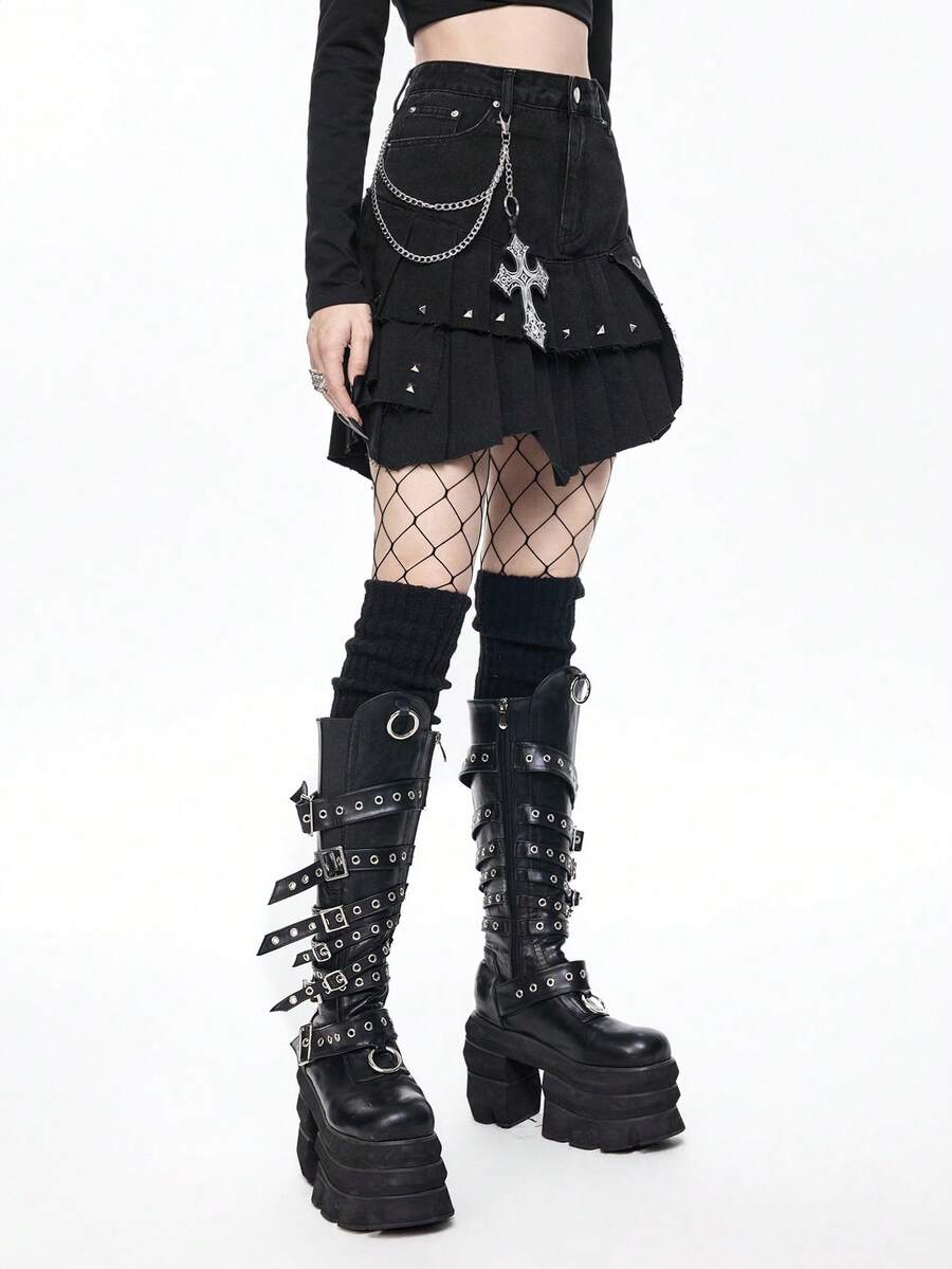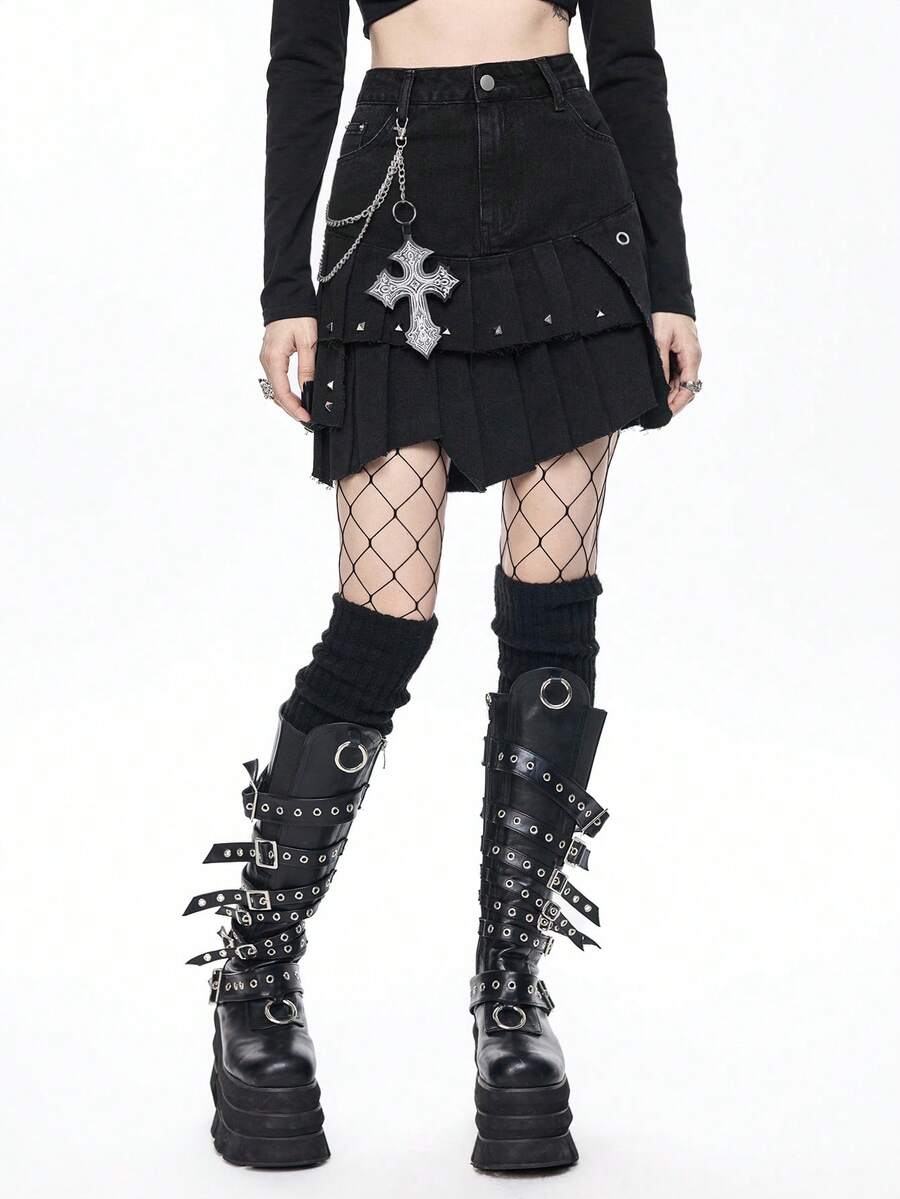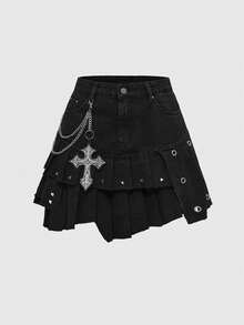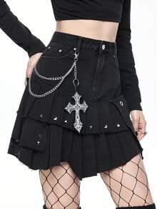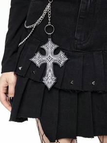 Grunge Punk Gotischer Kreuz-Stickerei Metall-Ketten Anhänger A-Linie Plissee Denim Rock