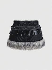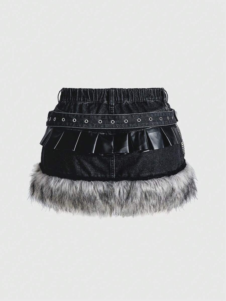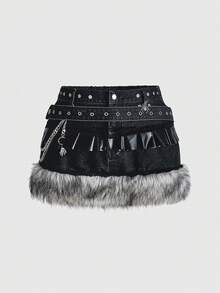 Grunge Punk Grunge-Punk Y2K Vintage Patchwork Kunstpelz PU Metall Spinnen Schädel Anhänger Super Kurzer Jeans Mini Rock, Große Größen Kpop Jeans Rock