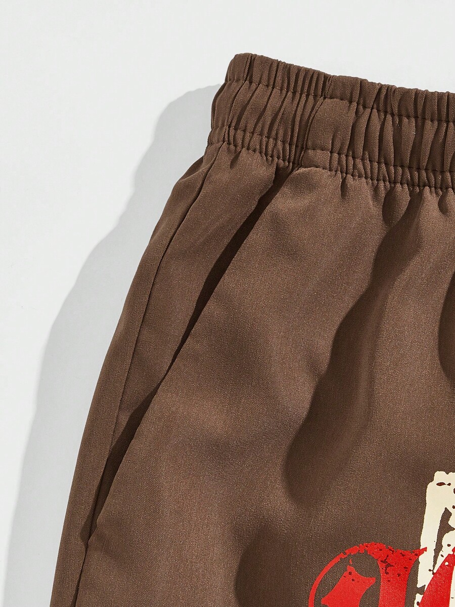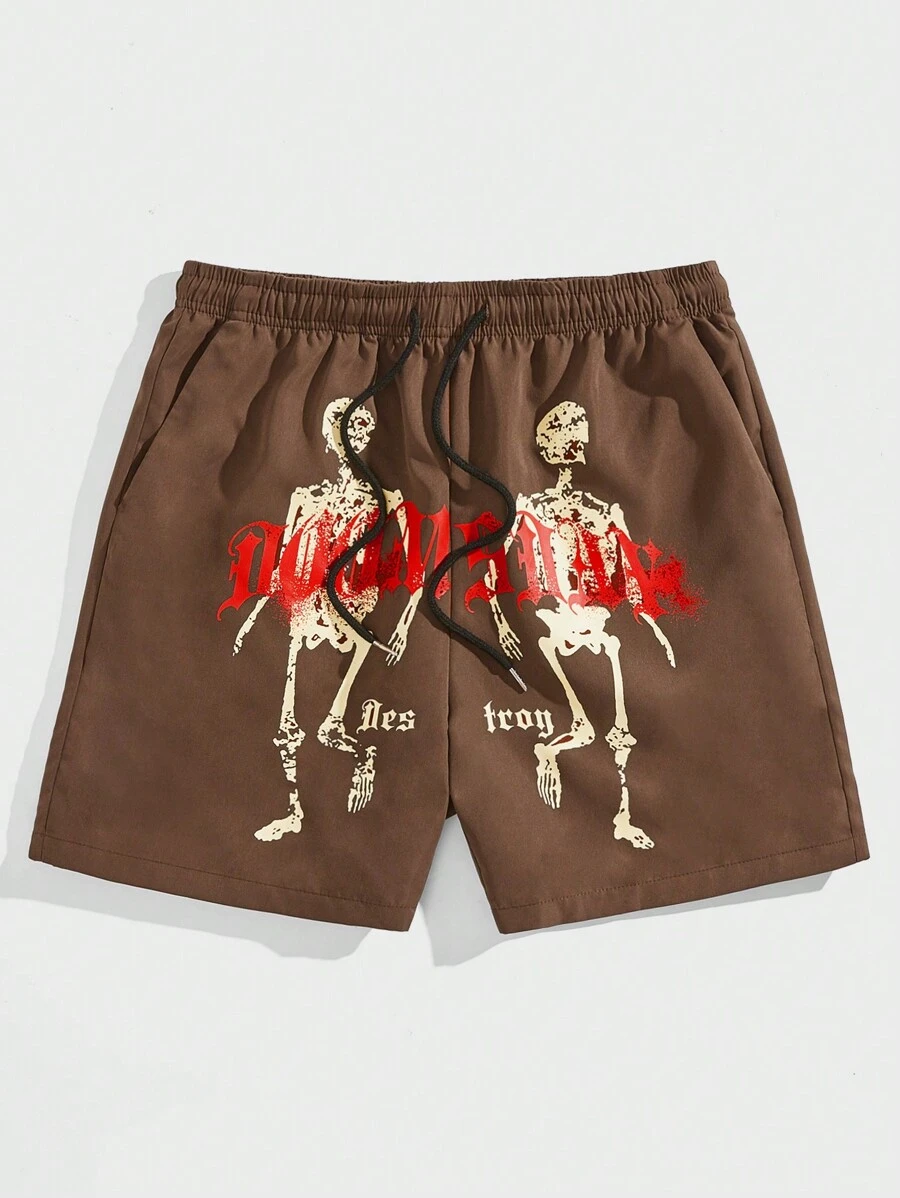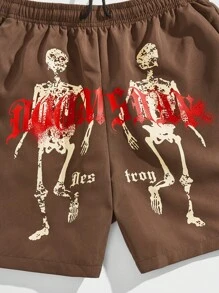 Grunge Punk Männer Shorts mit Skelett & Buchstaben Grafik, Tunnelzug,