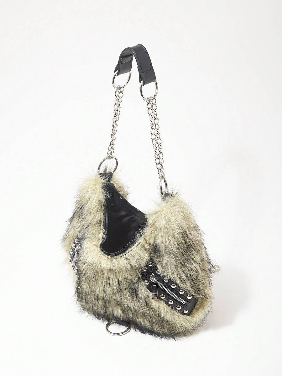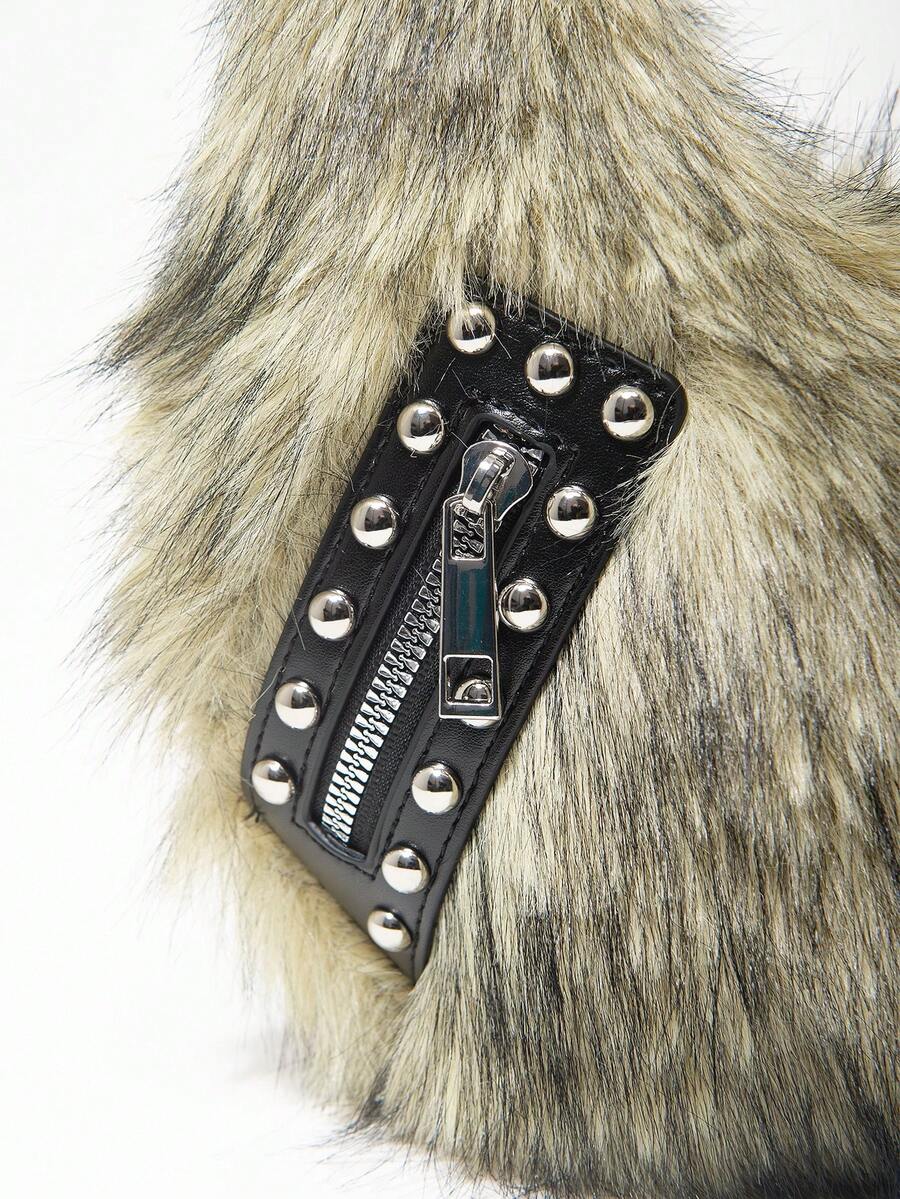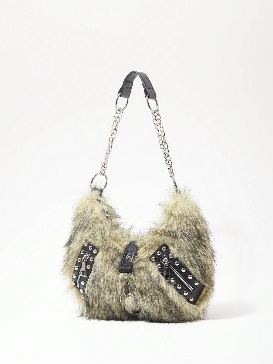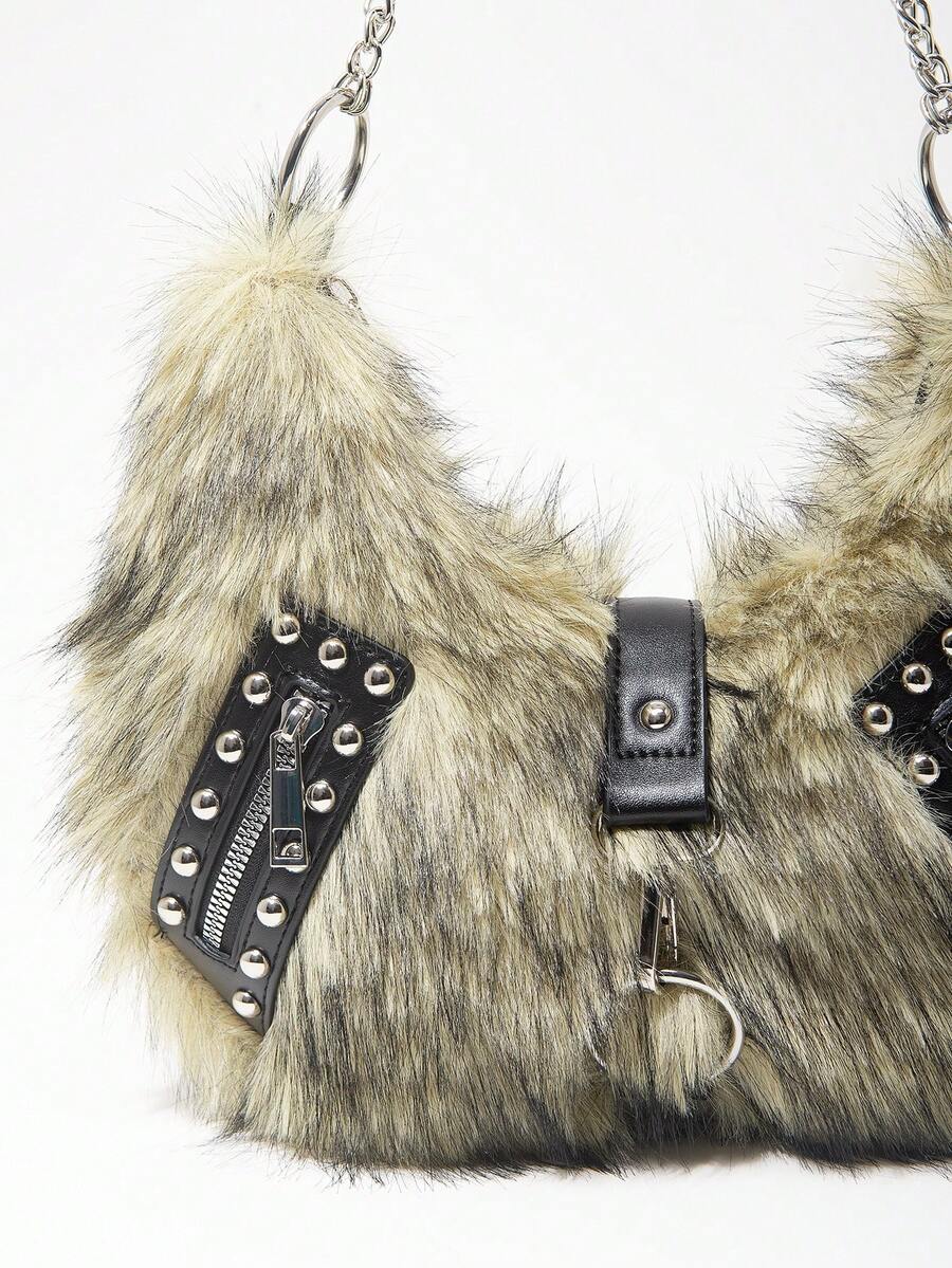 Grunge Punk Damen Umhängetasche, Hobo Tasche, Kunstfell, Plüsch, Nieten, modisch, personalisiert, vielseitig, Straße, süß und cool Mädchen, heiße Mädchen, Punk, Y2K, Alltag, Herbst und Winter (zufälliges Muster)