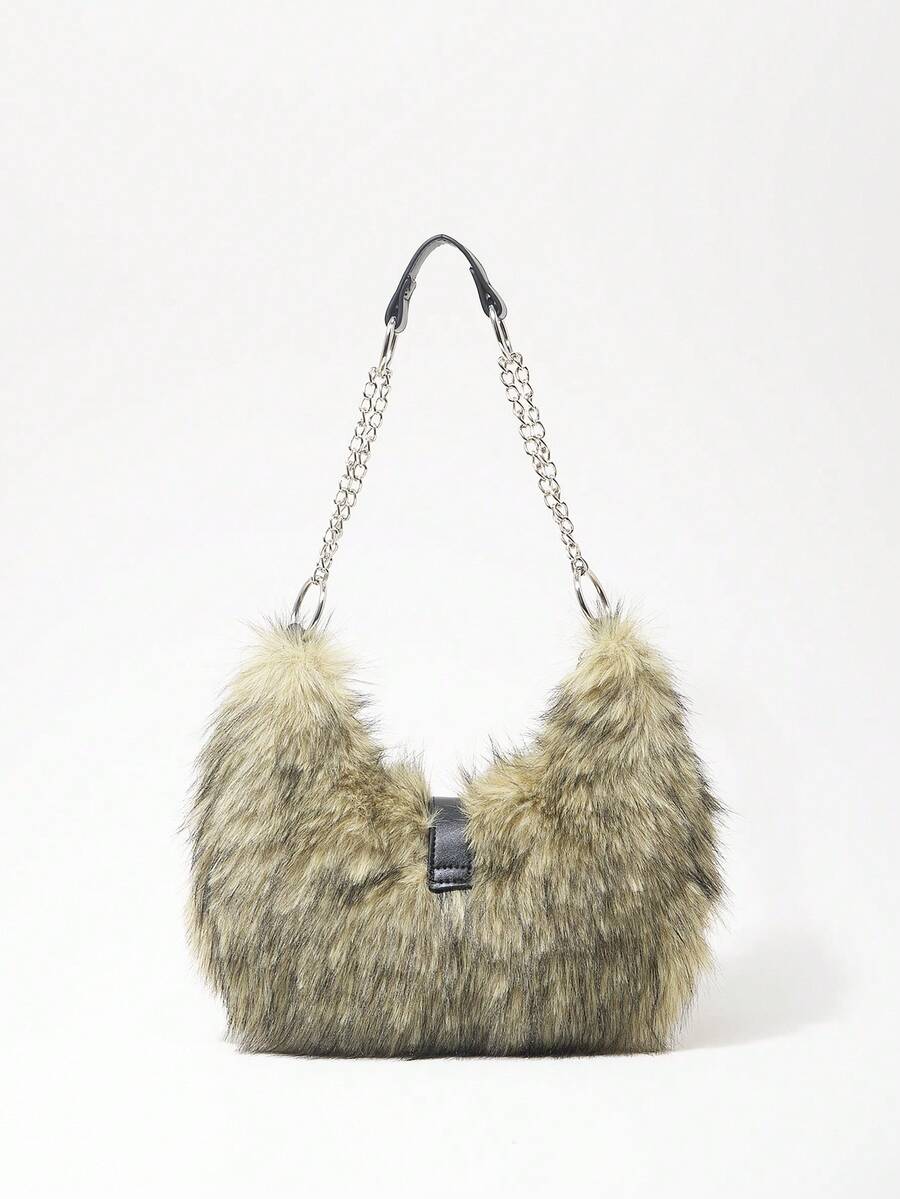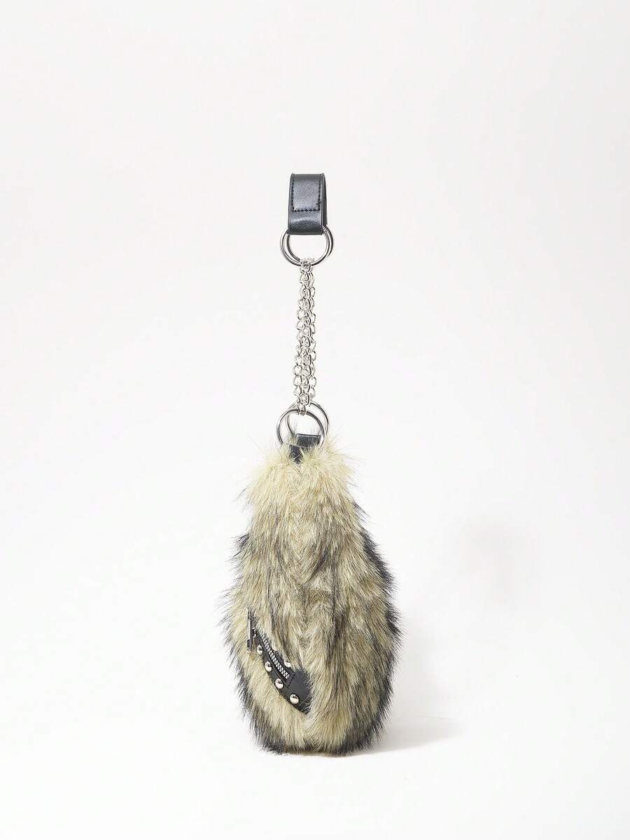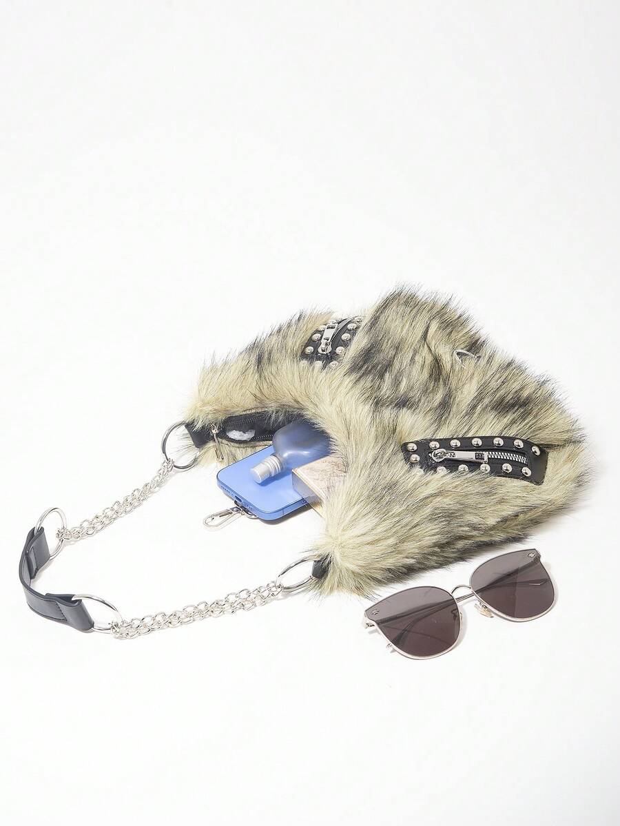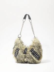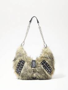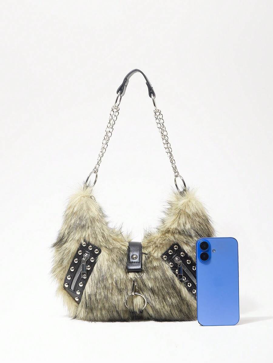 Grunge Punk Damen Umhängetasche, Hobo Tasche, Kunstfell, Plüsch, Nieten, modisch, personalisiert, vielseitig, Straße, süß und cool Mädchen, heiße Mädchen, Punk, Y2K, Alltag, Herbst und Winter (zufälliges Muster)