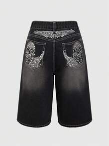 Grunge Punk Lässige, vintage-gewaschene Denim Shorts mit Punk Streetstyle Stickerei von Totenkopf und Flügeln, Schule
