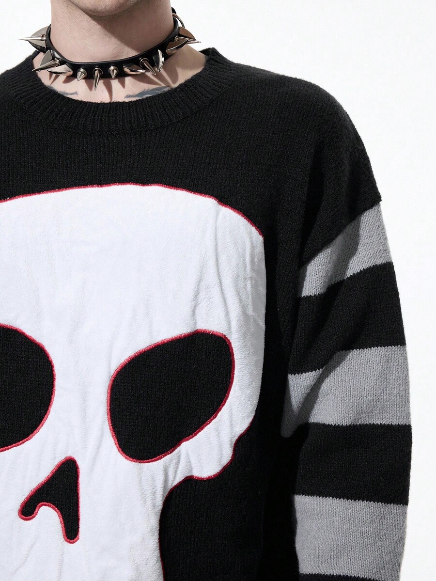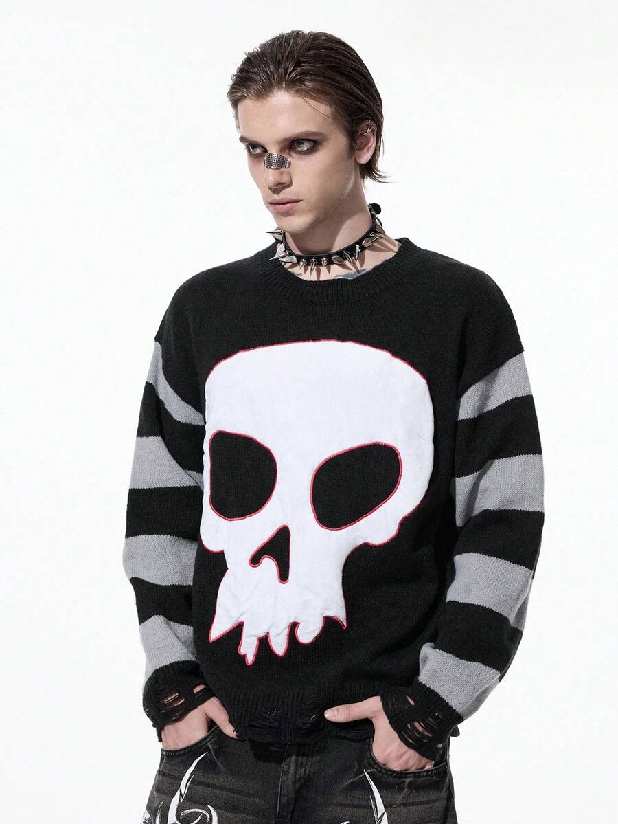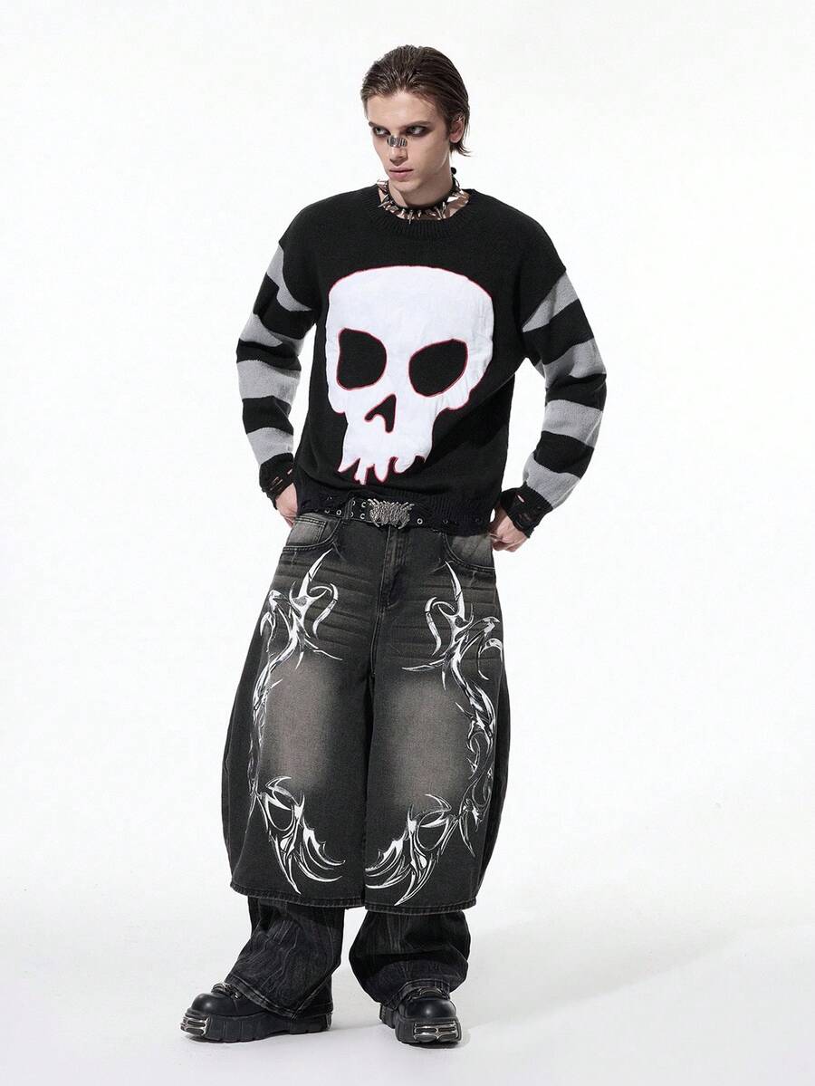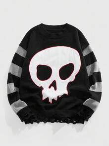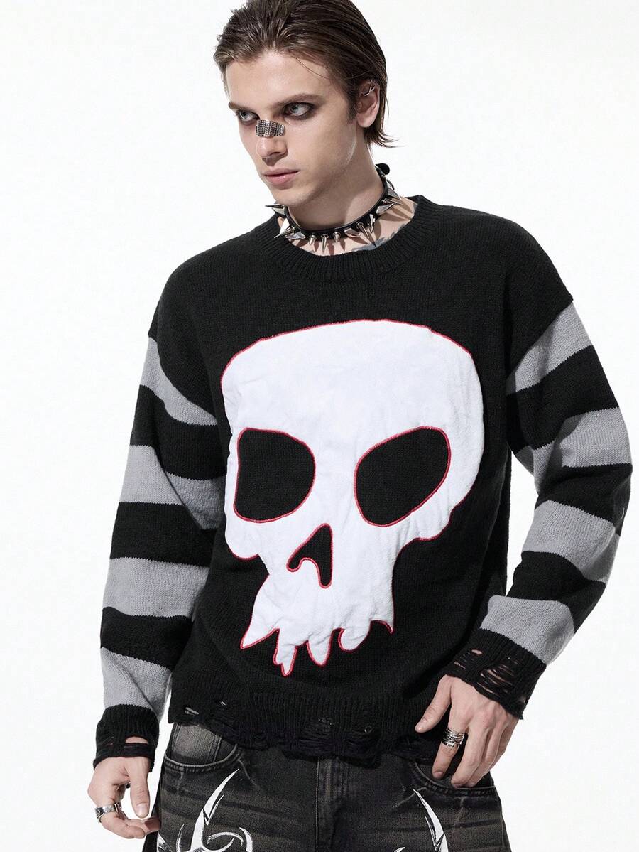Grunge Punk Herren lässiger, locker sitzender Pullover mit Totenkopf- und Streifenmuster, Rundhalsausschnitt, Drop-Shoulder und Langarm, Herbst