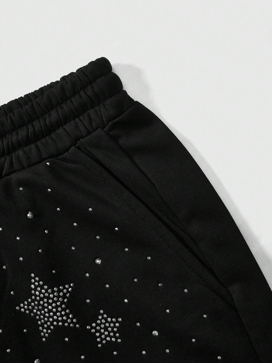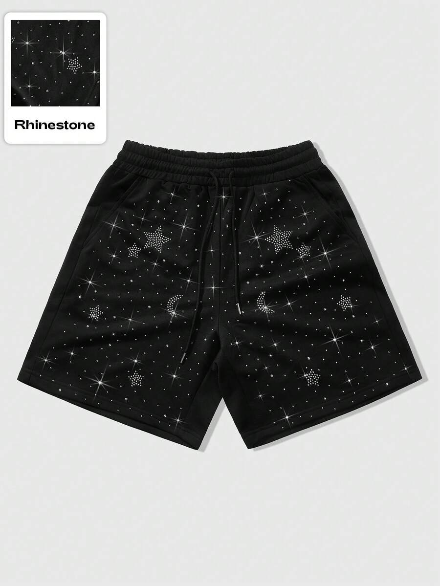 Grunge Punk Herren lässige Shorts mit Stern- und Mond-Muster, verziert mit Strass, stilvolle amerikanische Straßenmode, passendes Paar-Set