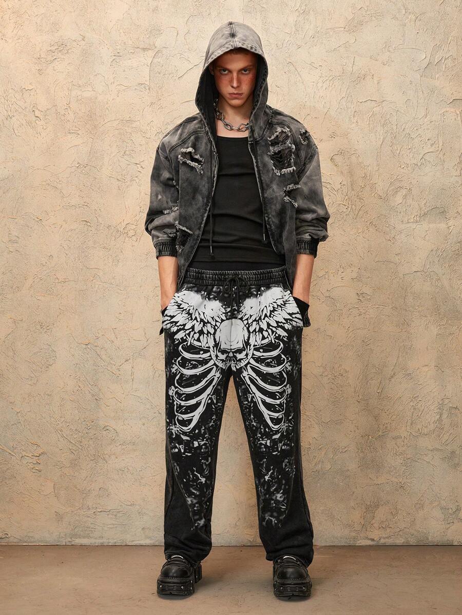 Grunge Punk Herren Lässige Jogginghose mit Flügel Muster, Kordel Taille, Taschen und weitem Bein