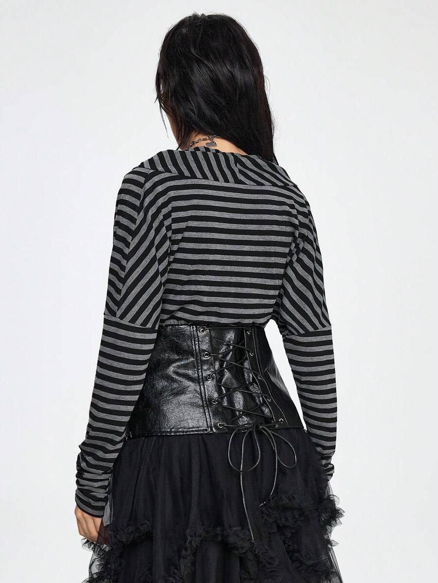 Grunge Punk Maritimer Punk Retro Schwarz & Grau gestreifter Patchwork PU Kragen Figurbetontes T-Shirt