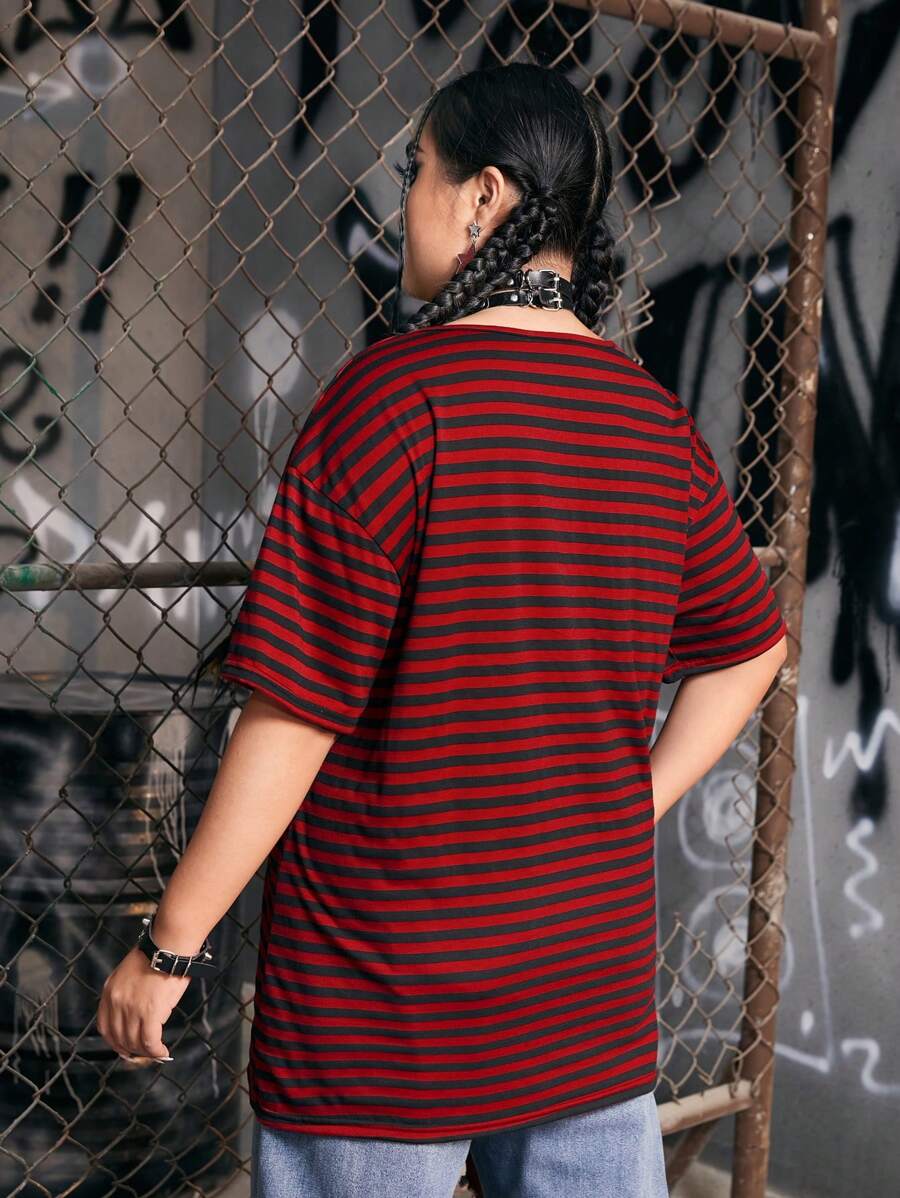 Grunge Punk Große Größe Drop Shoulder T-Shirt mit Streifen Muster