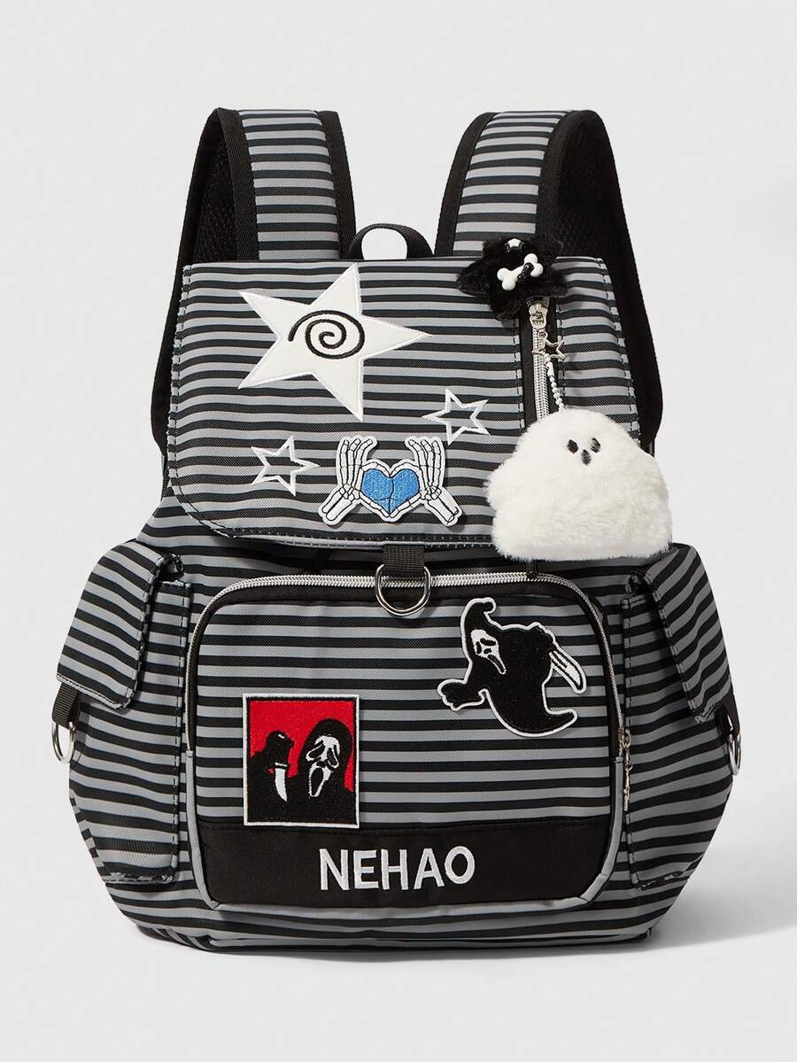 Grunge Punk Punk Academy Wind Schreiende Grimasse gestreifte Rucksack - Stern Patch und Geist Anhänger Seltsam süß Multi-Tasche Rucksack Mode Casual Unisex Großer Rucksack für Pendeln, Schule, Reisen und täglichen Gebrauch