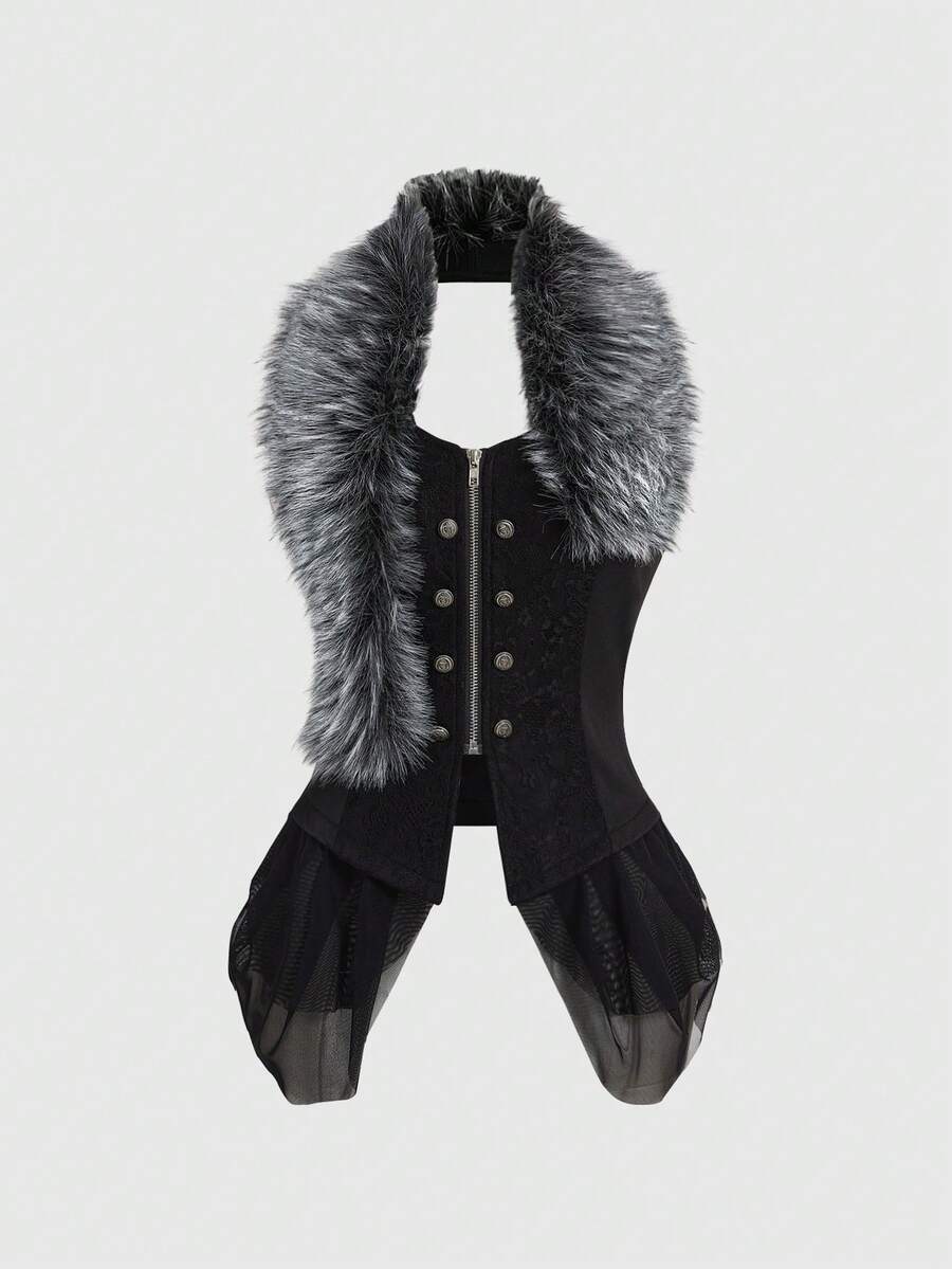 Grunge Punk Punk Nautisches Mesh Patchwork abnehmbarer High-Low Fellkragen rückenfreies Design Damen Top