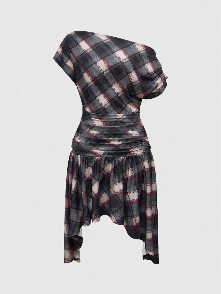 Grunge Punk Retro-elegantes asymmetrisches Schulterdesign, Taillen-Raffung, asymmetrischer Saum mit Karomuster Kleid