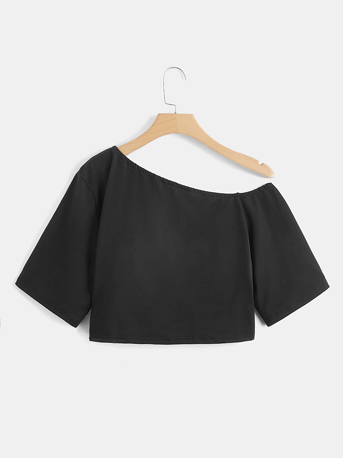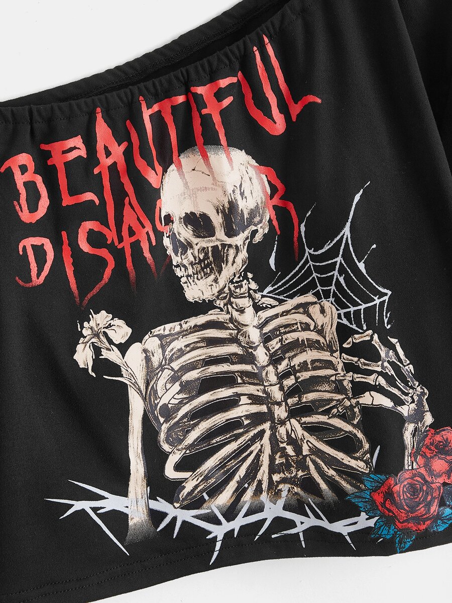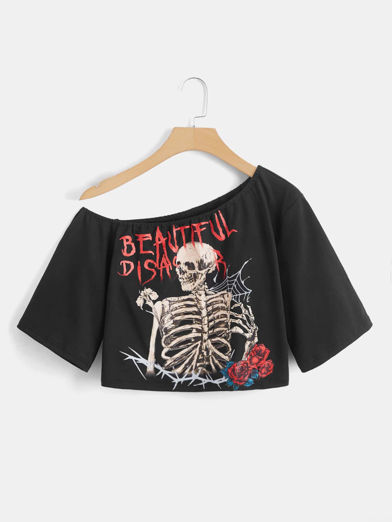Grunge Punk Asymmetrisches Crop Top mit Schädel- und Blumen Muster, Schule