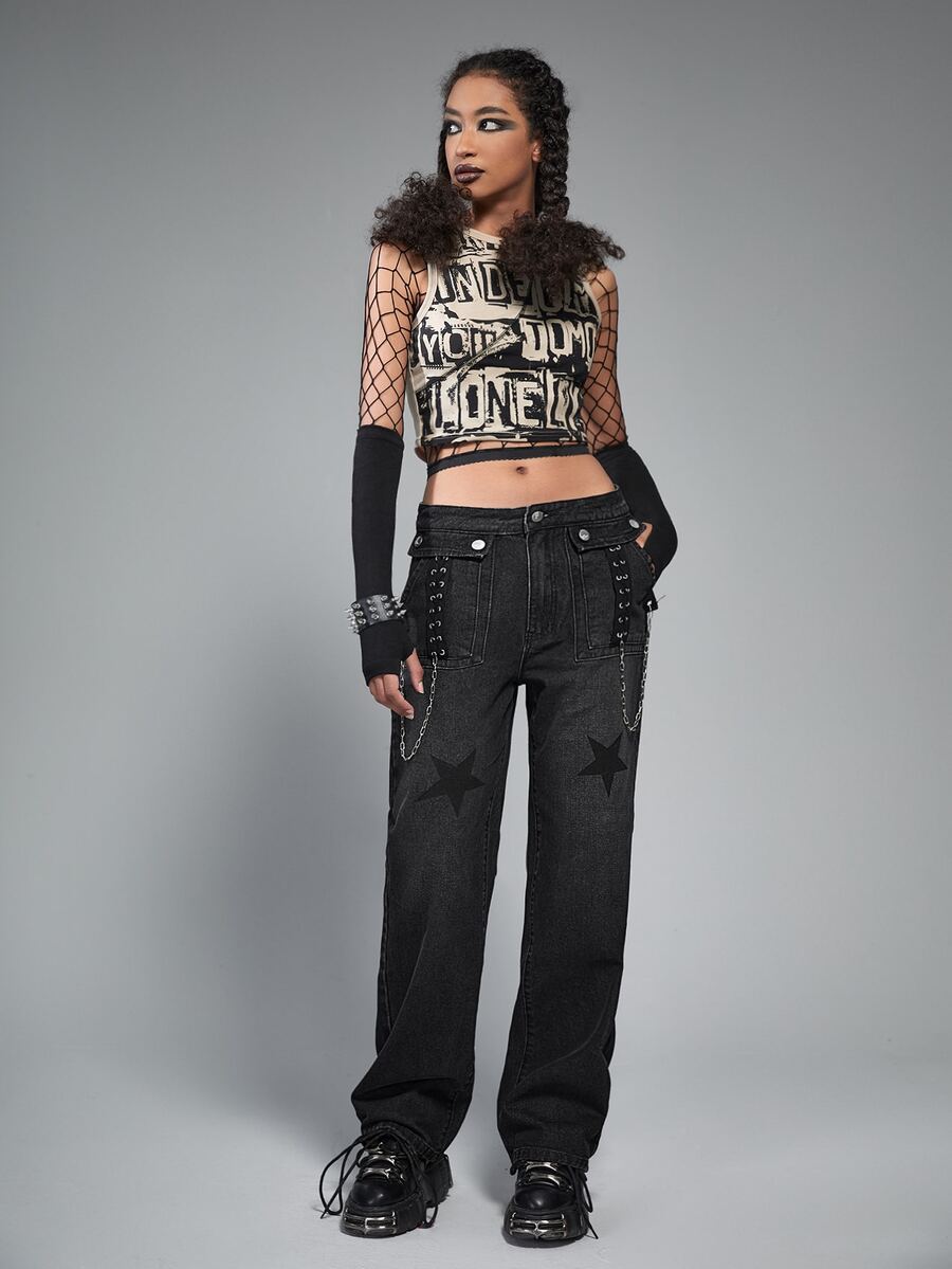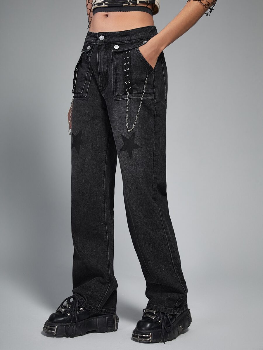 Grunge Punk Jeans mit Stern Muster, Kette Detail