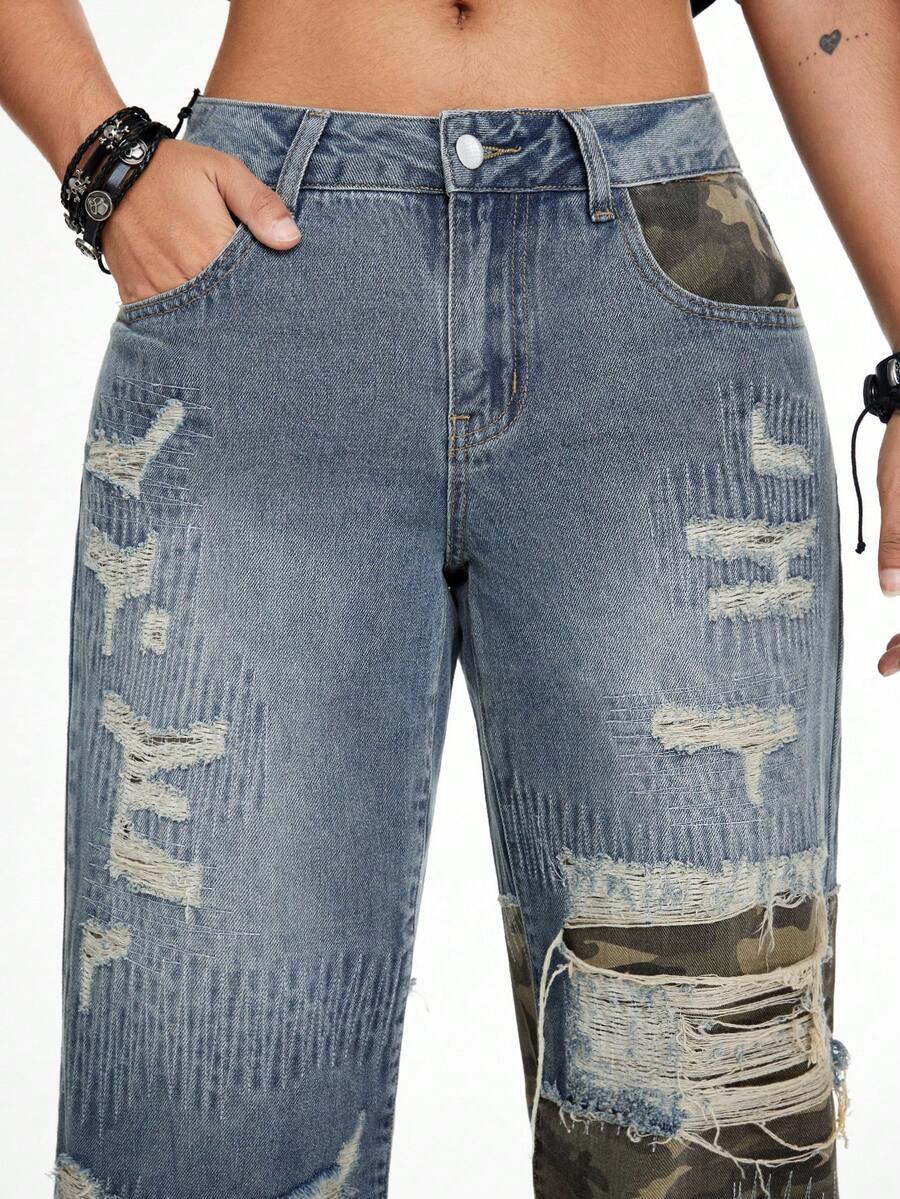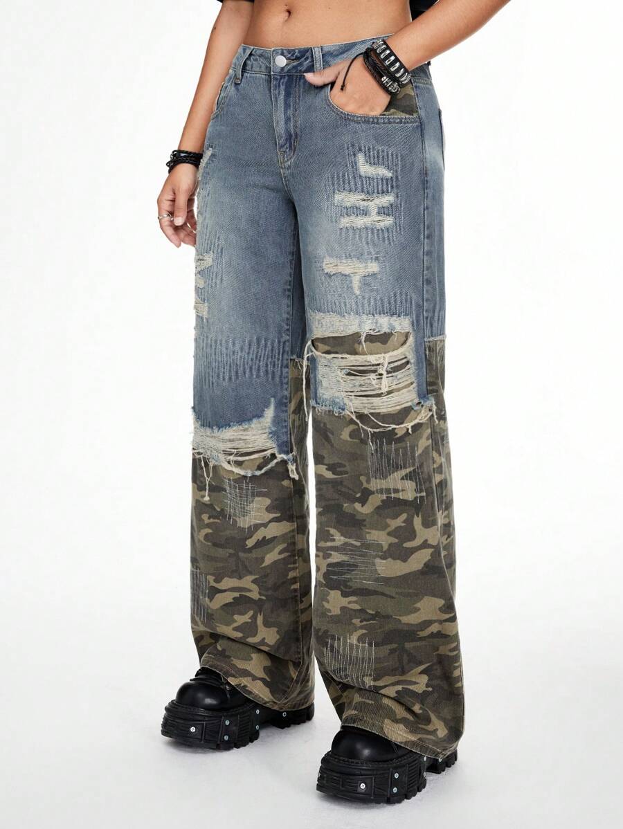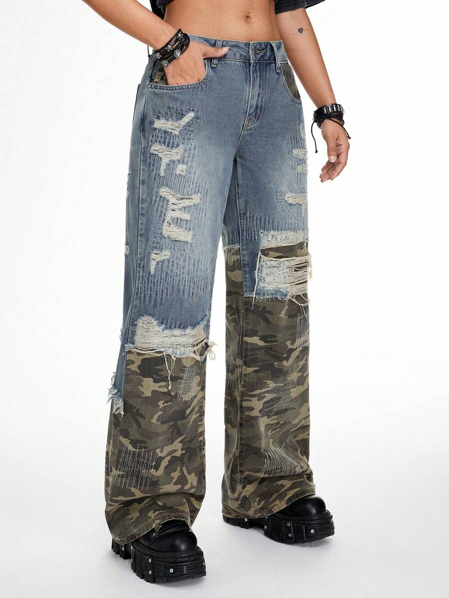 Grunge Punk Unisex Distressed Loose Fit Weites Bein Camouflage Patchwork Denim Jeans - Avantgardistischer Wasteland Street Style