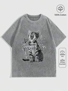 Grunge Punk Vintage ausgewaschenes Damen Oversize T-Shirt mit Schneeflocken und Katzen Motiv, für Schule