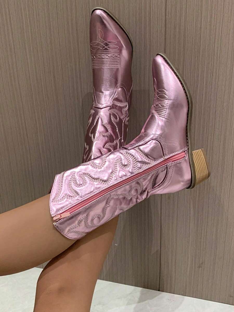 Grunge Punk Frauen besticktem Detail, seitlichem Reißverschluss, spitzer Zehenpartie, Westernstiefel, Funky Outdoor Stiefel