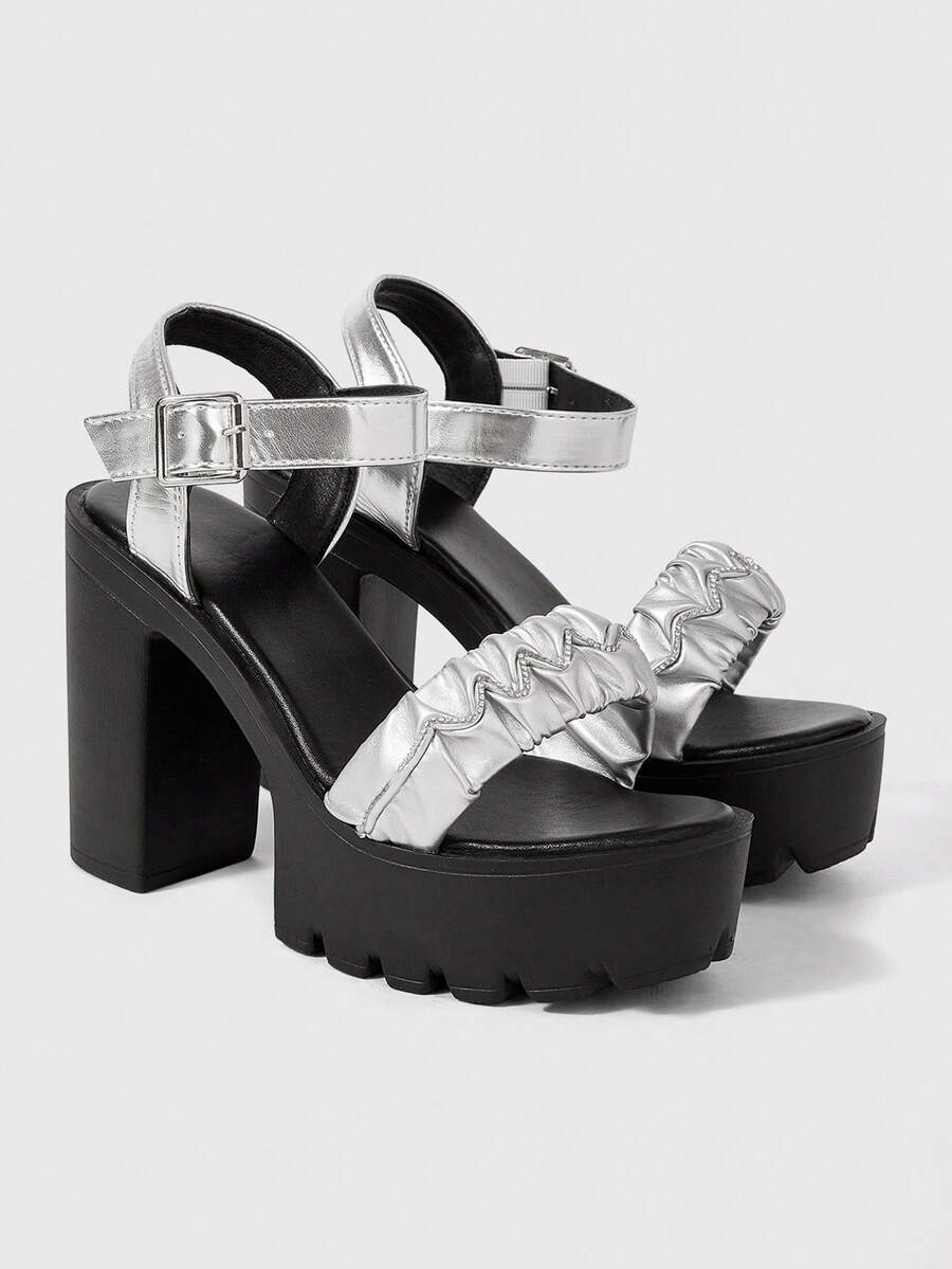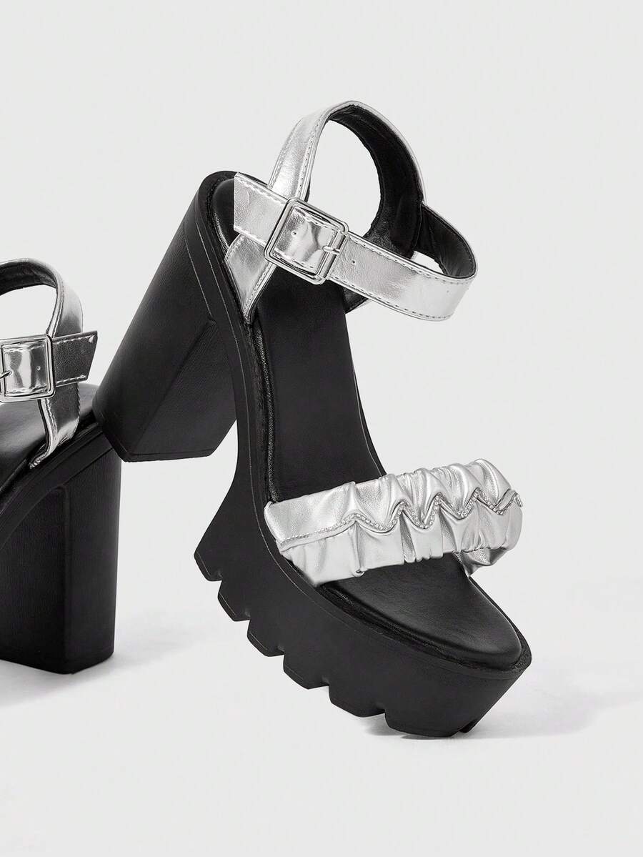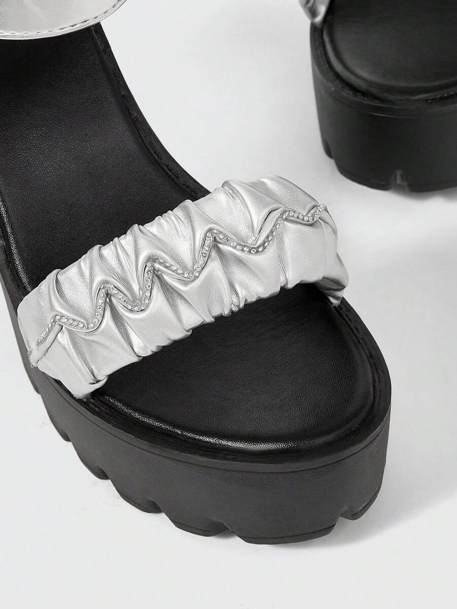 Grunge Punk Damen Silber High Heel Schuhe, Sommer offene Zehen Kristall funkelnde Party Kleider Schuhe, Plateau-Absatz Büro Arbeit Schuhe, Riemen Schnalle Niedrig Absatz Damen Sandalen