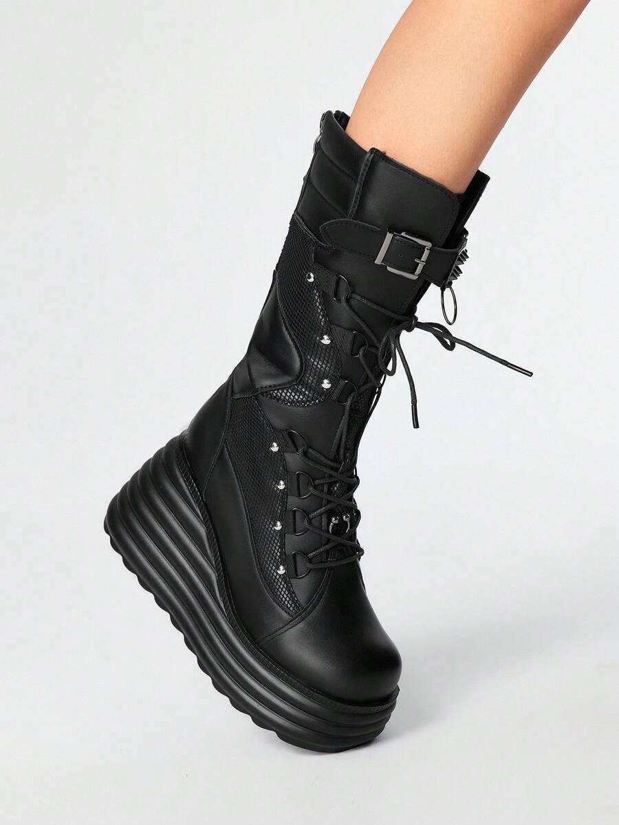 Grunge Punk Damen Schwarze Mesh-Panel Plateau Keilabsatz Stiefel Wadenlang Punk Stil Nieten Goth Dunkel Lässig Schuhe, Halloween