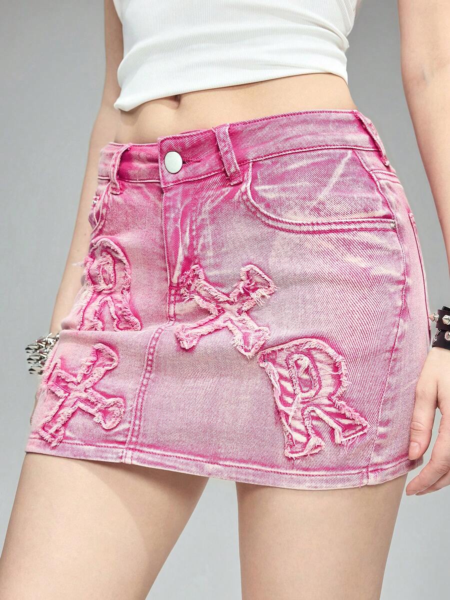 Damen Mini-Denim Rock mit Kreuz-Stickerei, ausgefranster Kante, elastischem Bund und gewaschener Denim-Optik, für den Sommer
