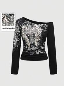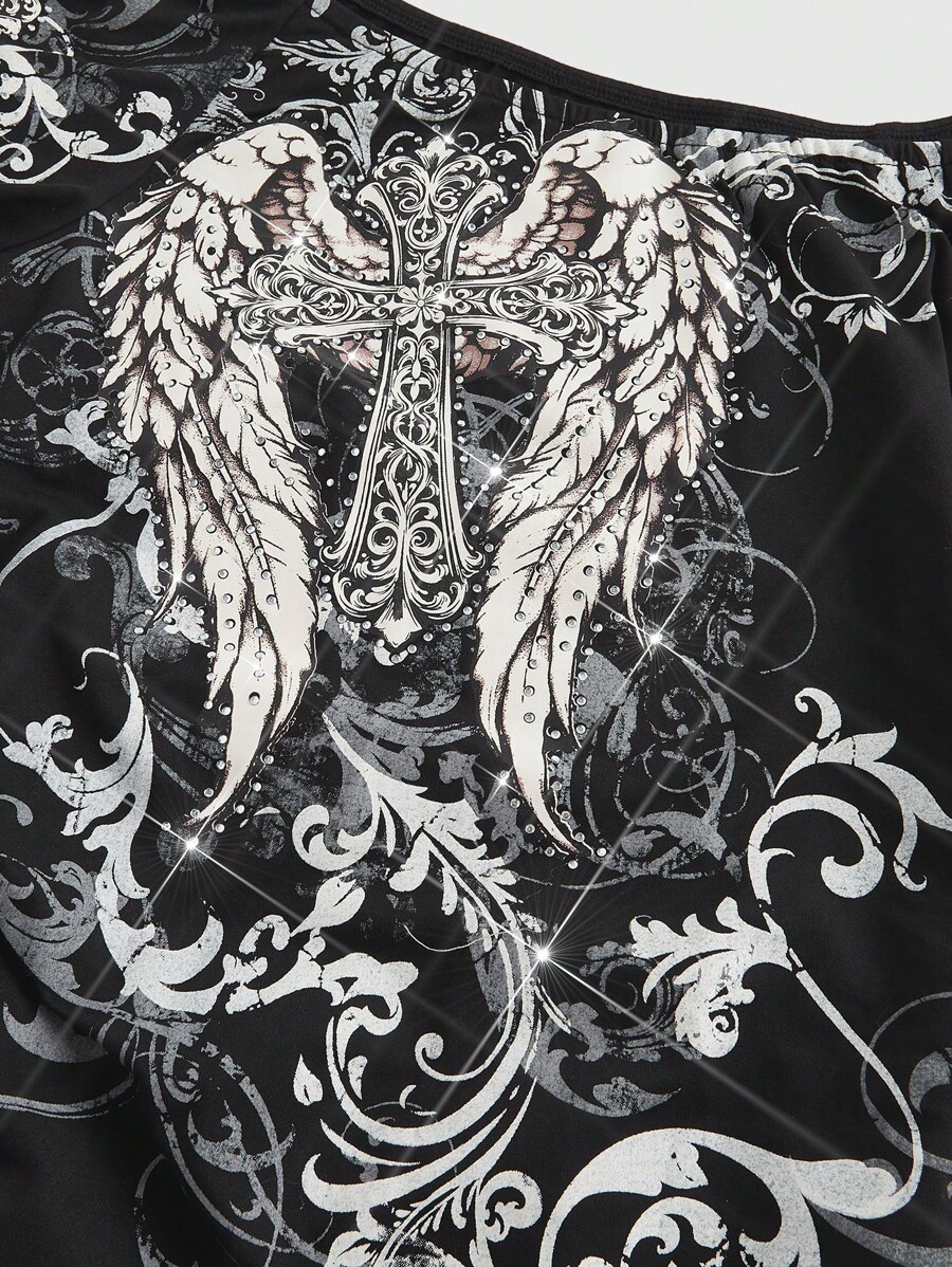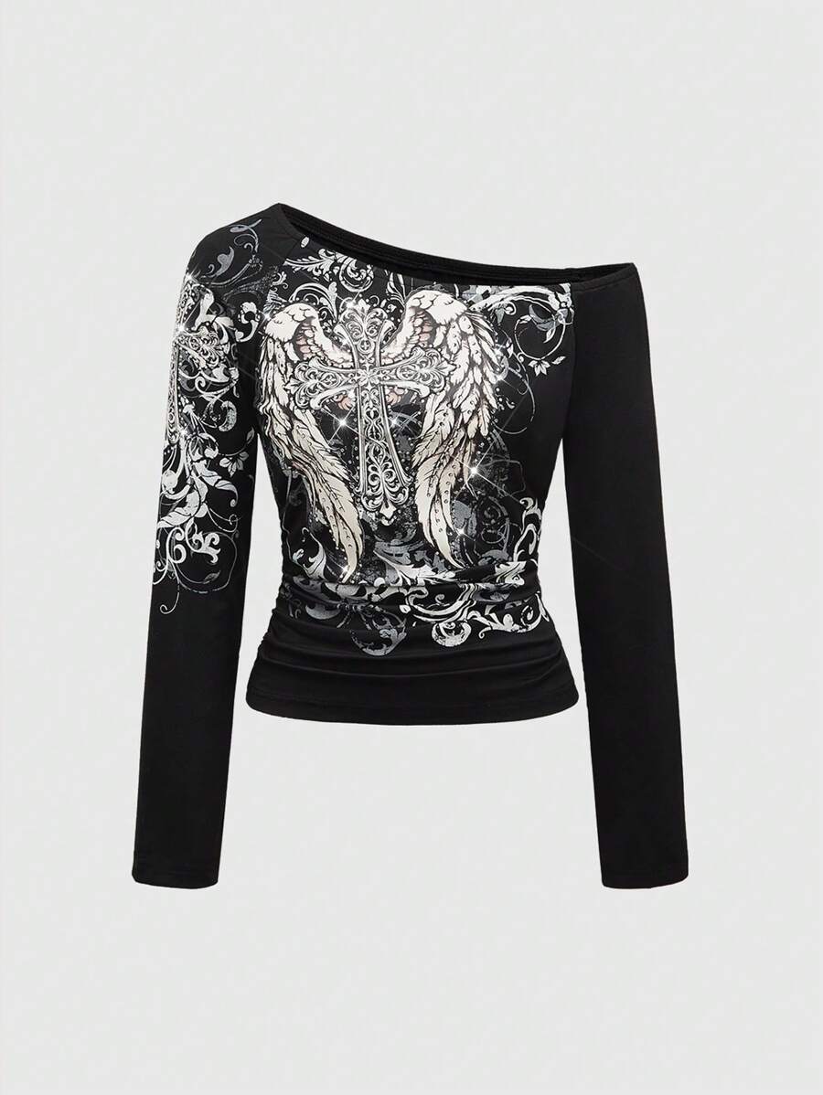 Grunge Punk Damen Kreuz Strass Glitzerprint Rüschenbesatz Schräge Schulter T-Shirt