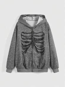 Grunge Punk Damen Grunge Ketten Muster Langarm Reißverschluss Kaschulle Lässig Hoodie