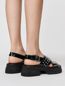Grunge Punk Damen Silber Kreuz-Riemen Römische Sandalen, Punk Nieten Plateau Keilabsatz Sommer Strand Urlaub Schuhe