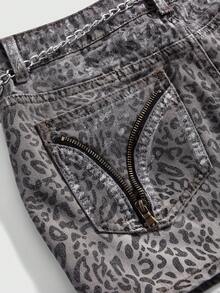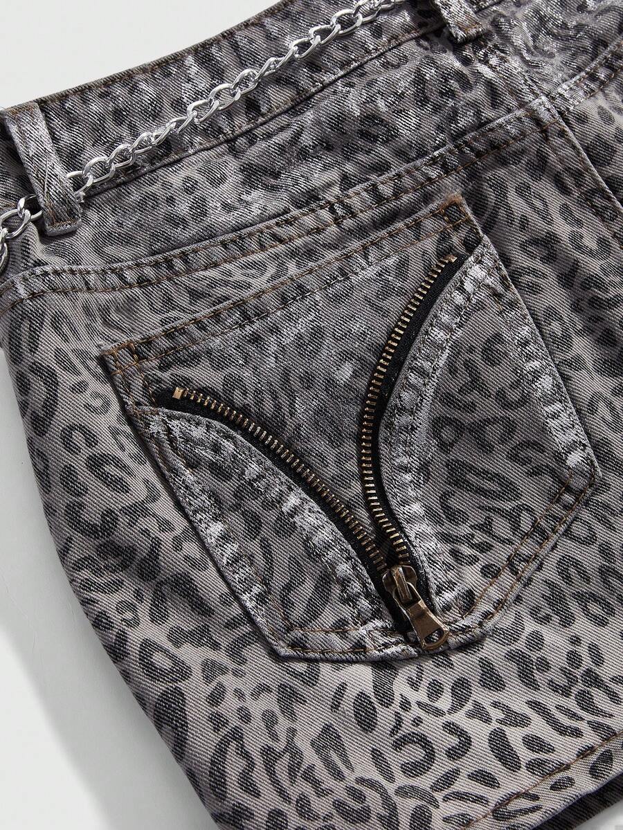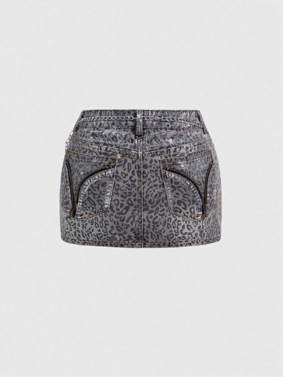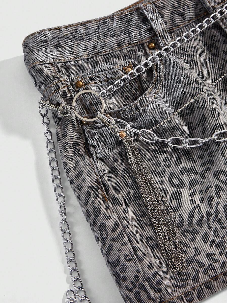 Grunge Punk Y2K Leoparden-Muster Metallic Strass-Ketten Super Tief Sitzender Mini-Denim Rock