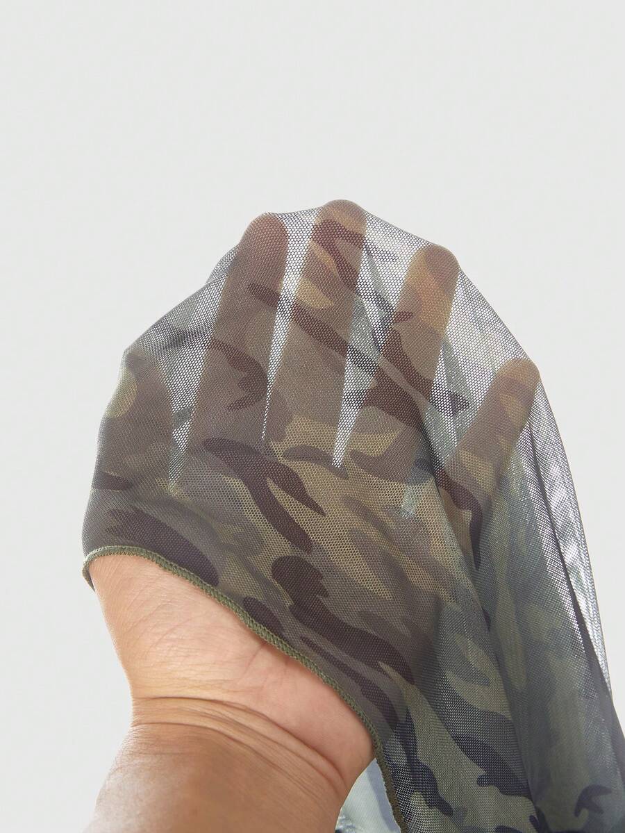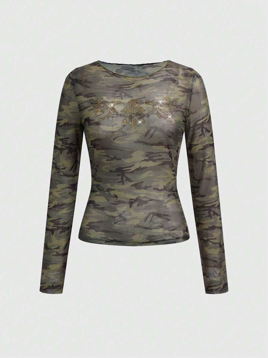 Grunge Punk Y2K Retro Camouflage Mesh Cross Wing Strass verzierte figurbetonende Langarm Bluse für Frauen