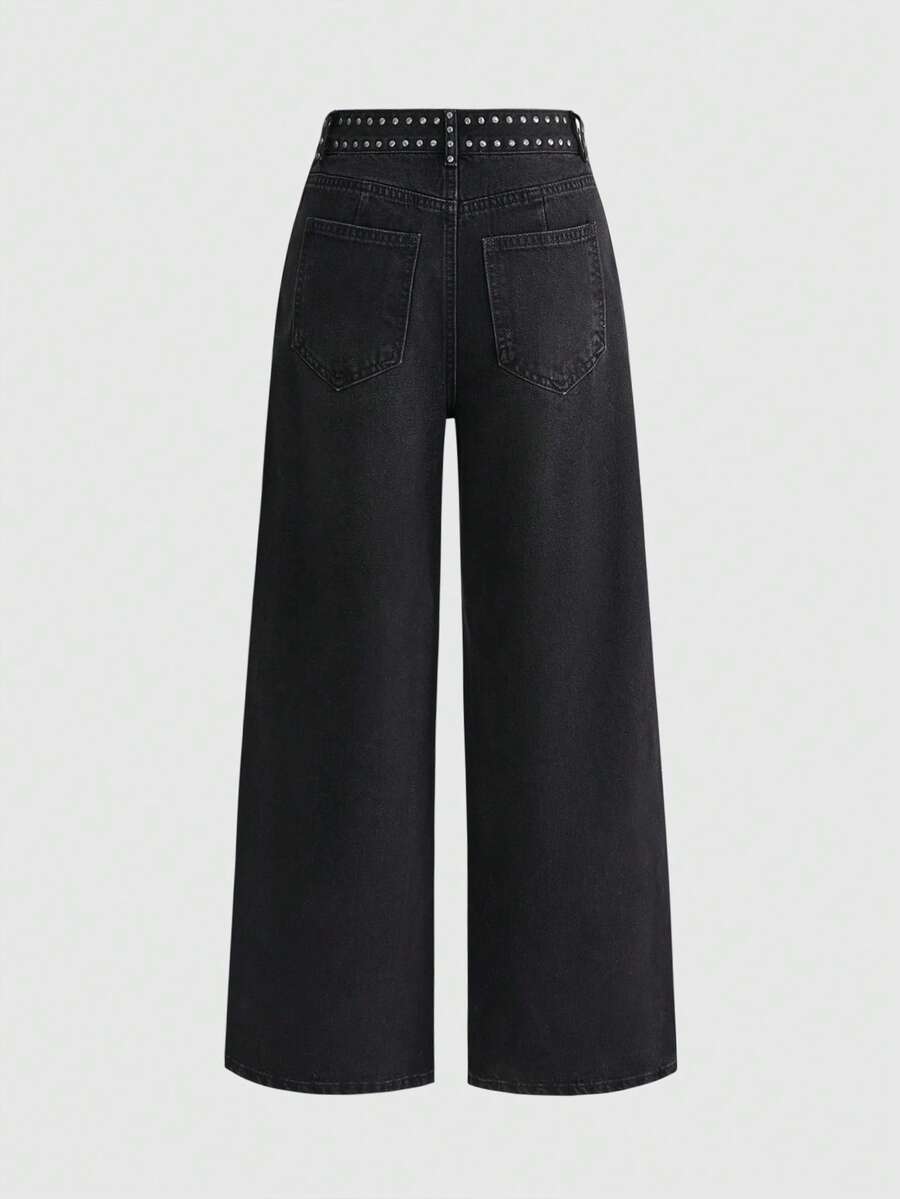Grunge Punk Y2K Retro Millennium Baddie Punk Nieten Design vielseitige Damen Jeans mit tiefer Taille und weitem, geradem Bein