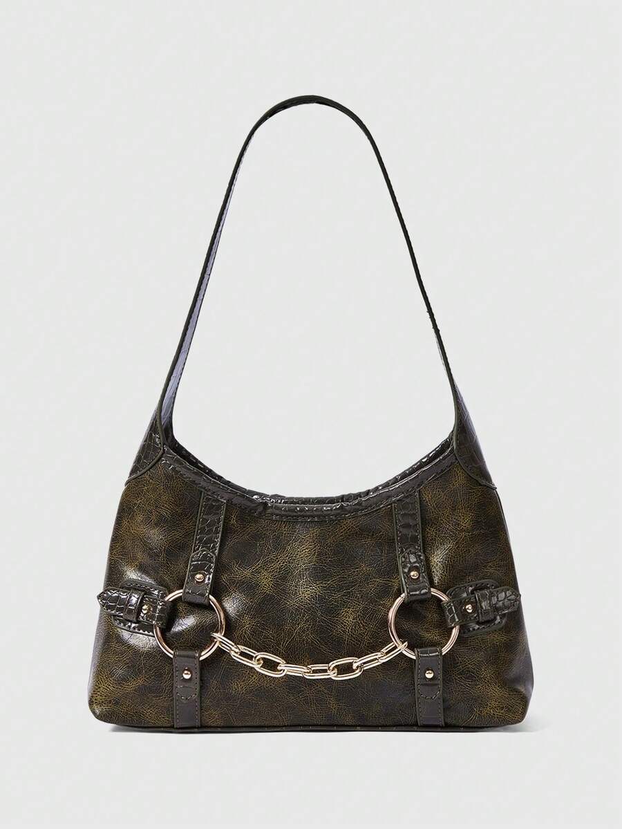 Grunge Punk Y2K Umhängetasche mit Kettenelement, Punk Gothic Hobo Tasche, Streetstyle Handtasche